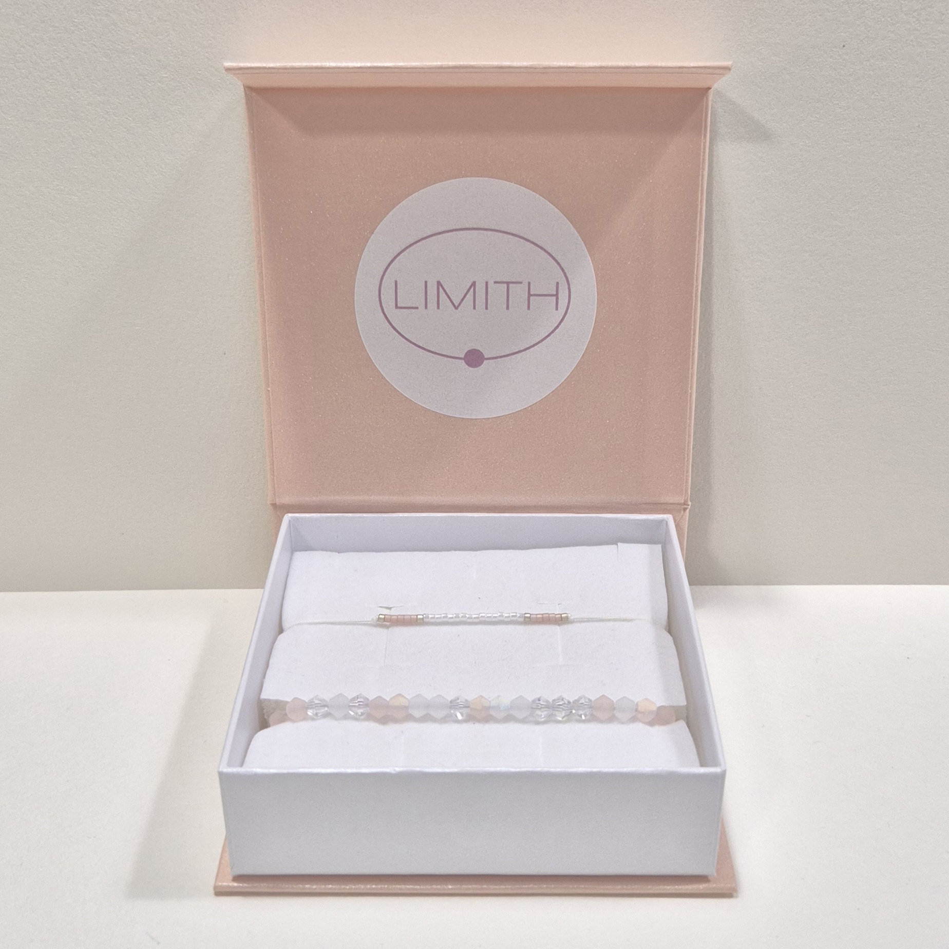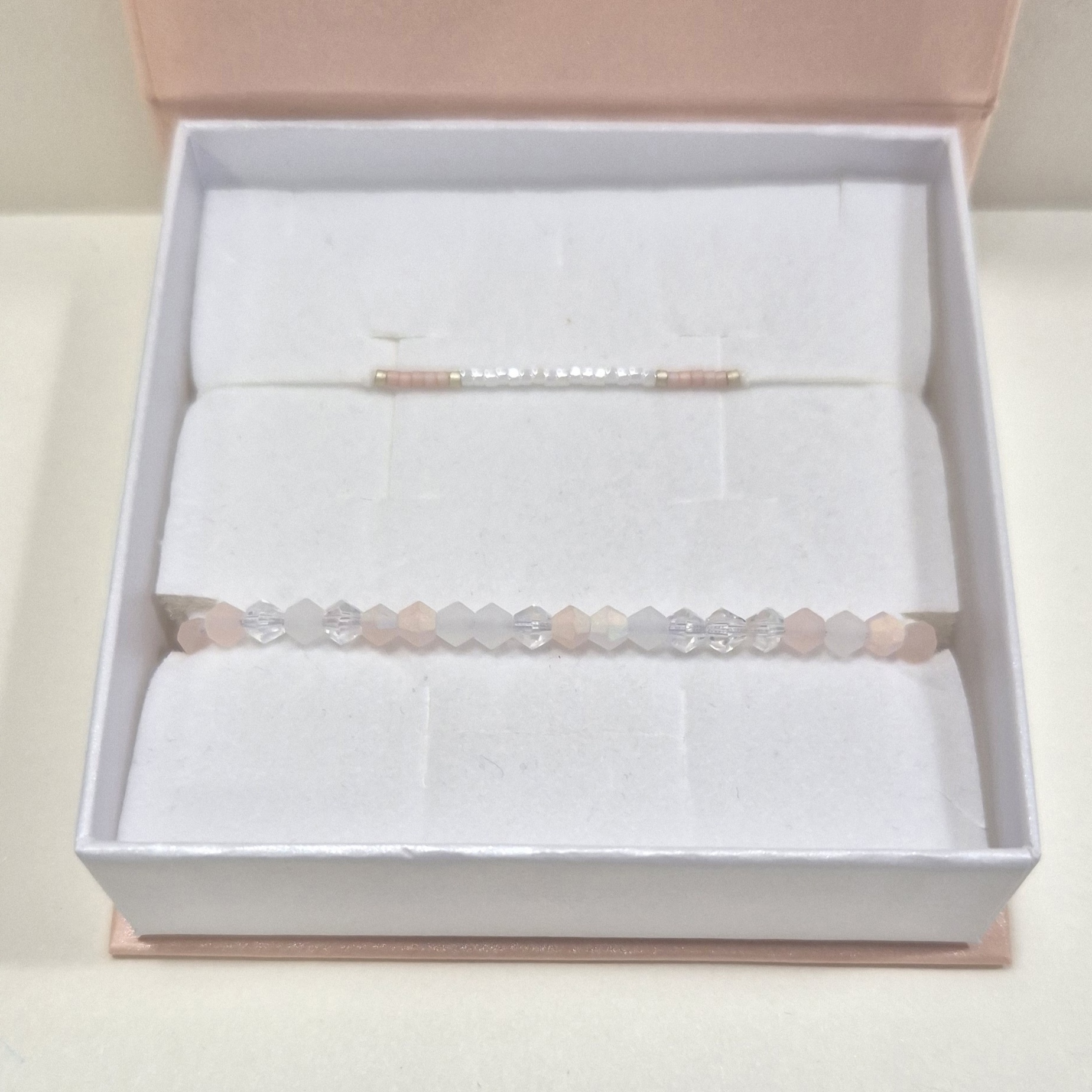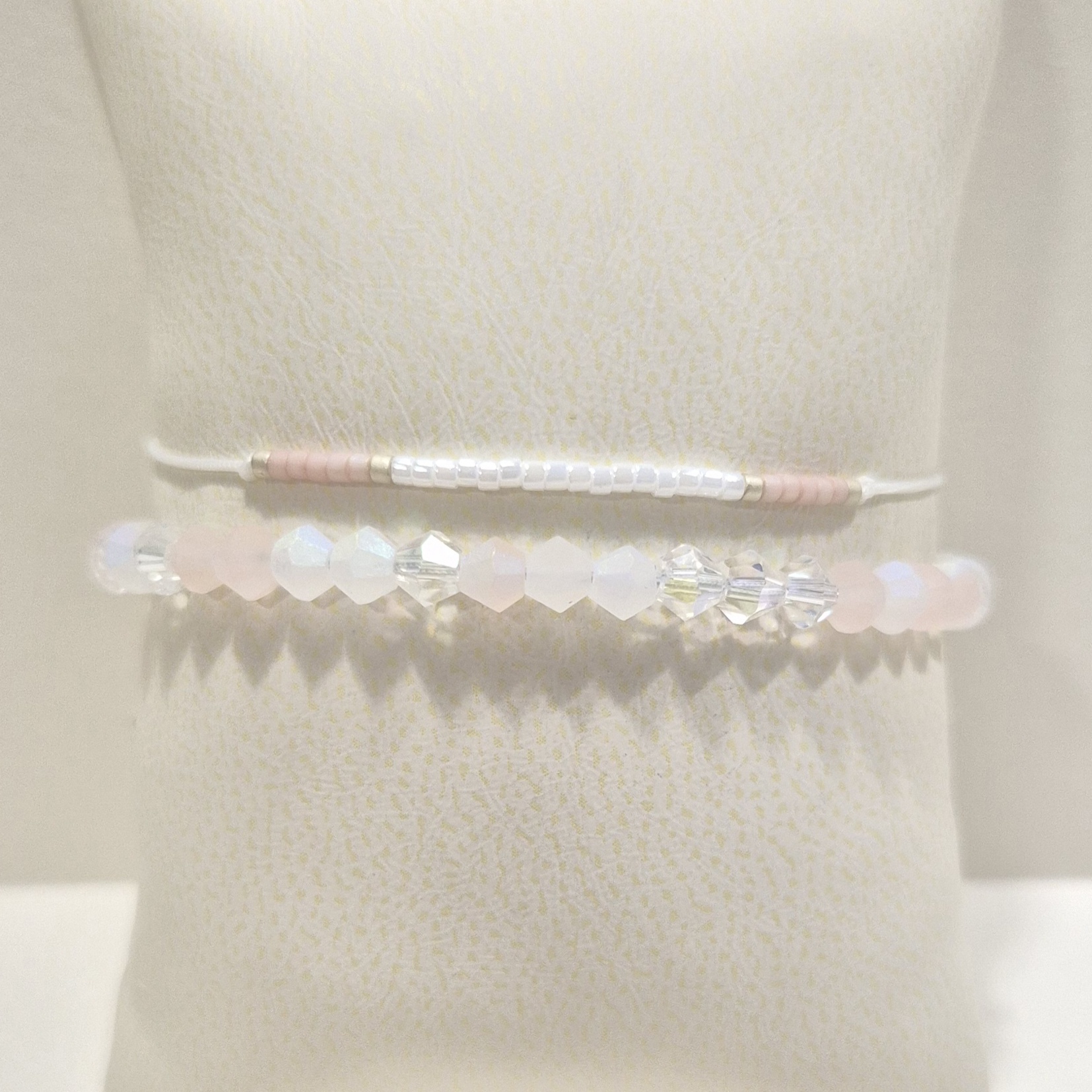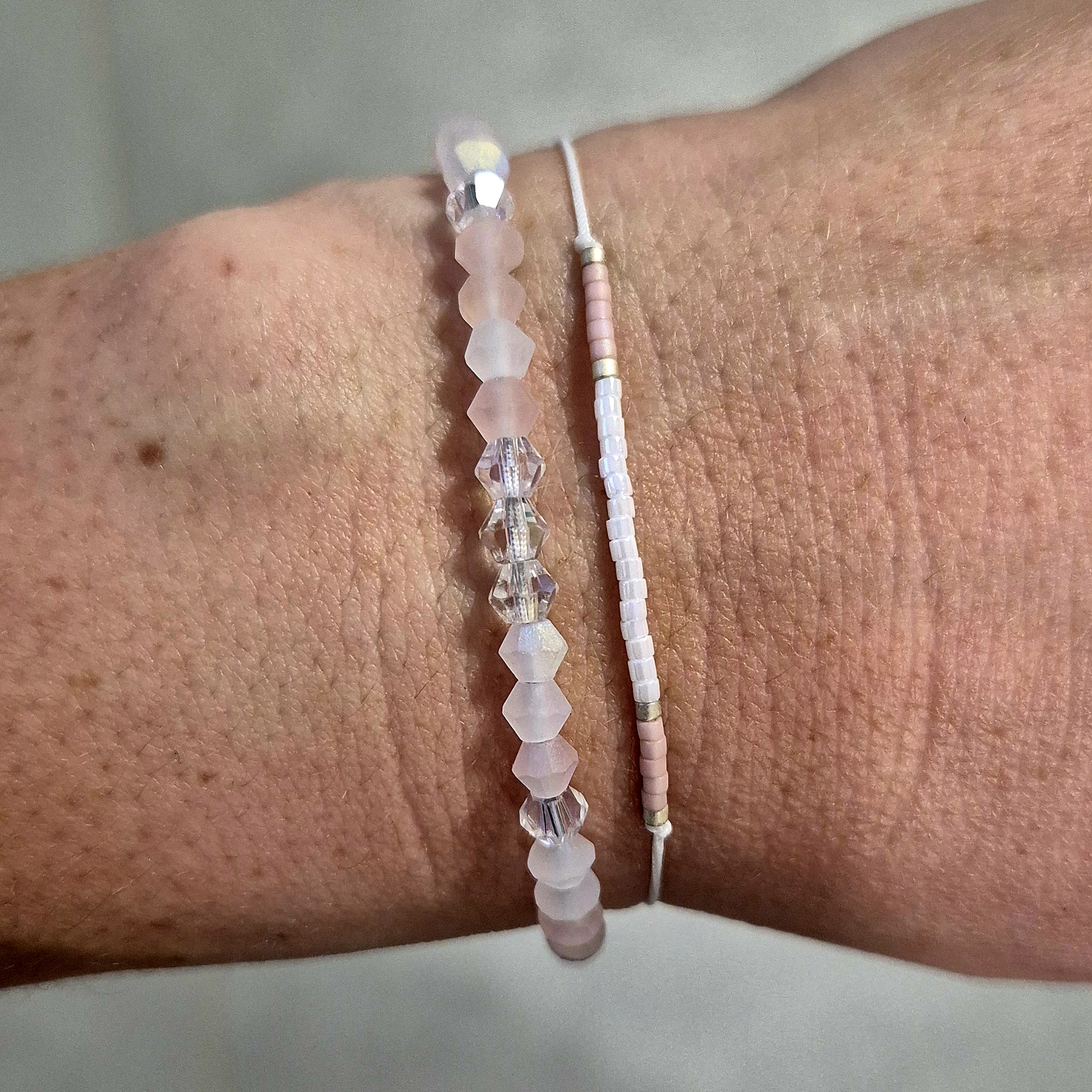 První náramek je zdobený broušenými korálky v bíléa růžové barvě.