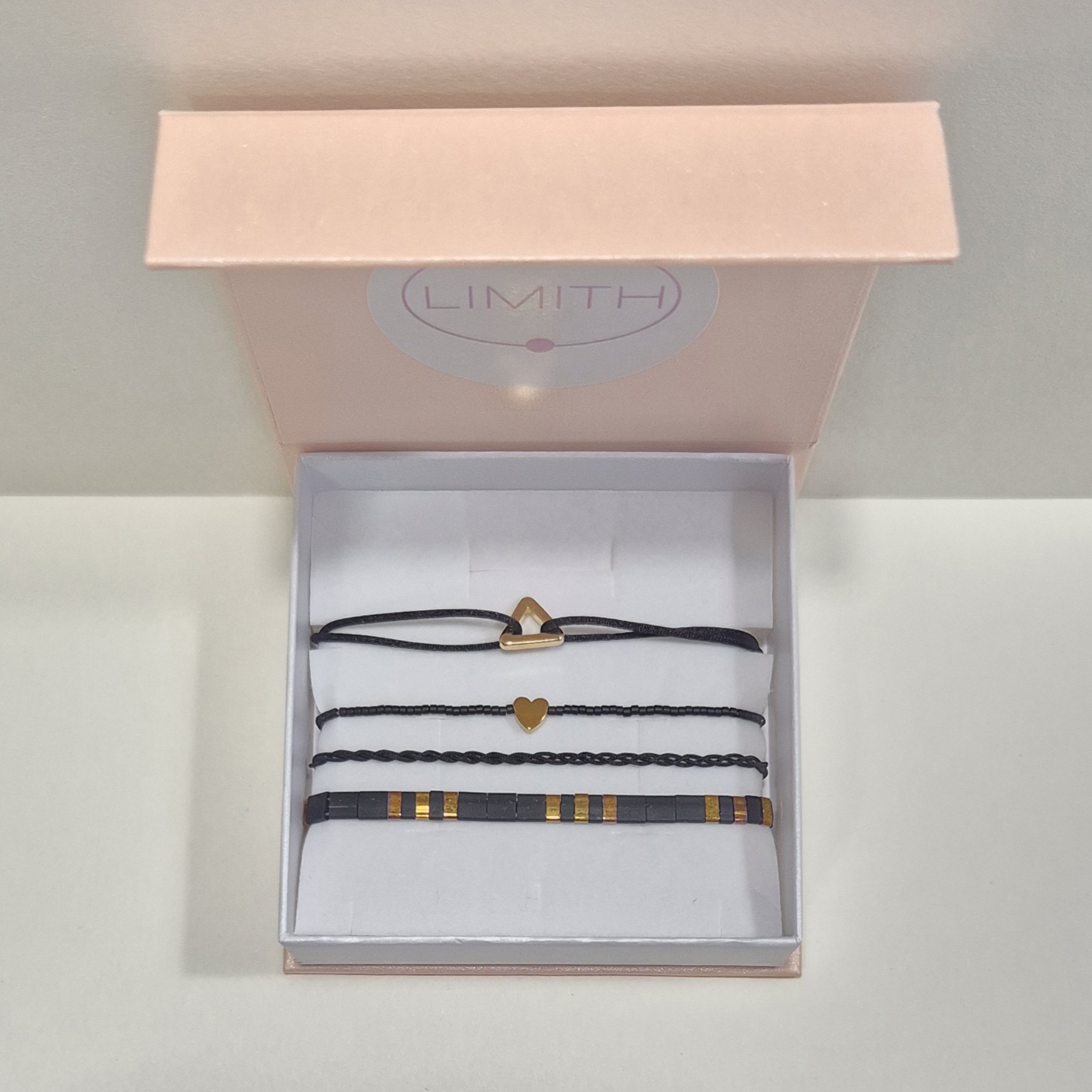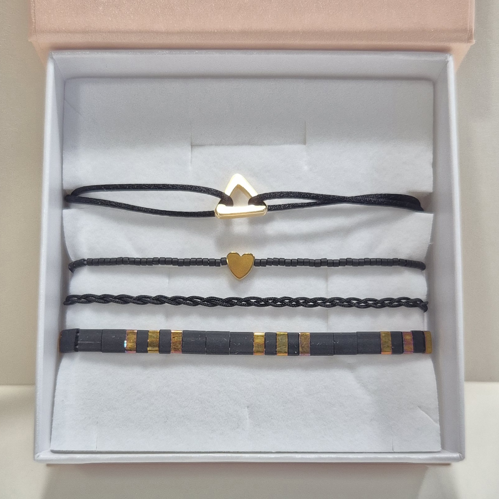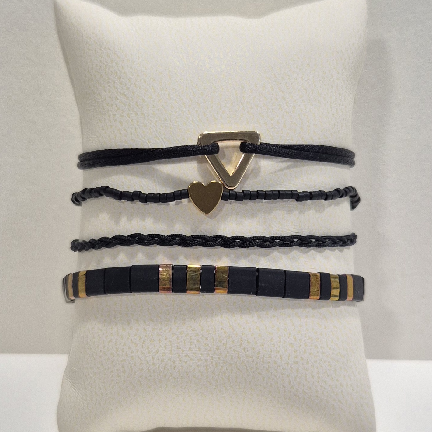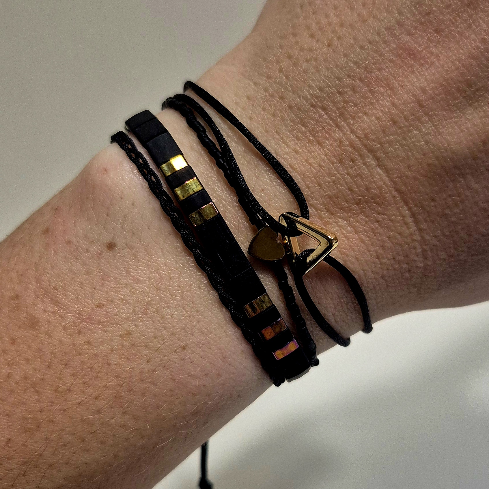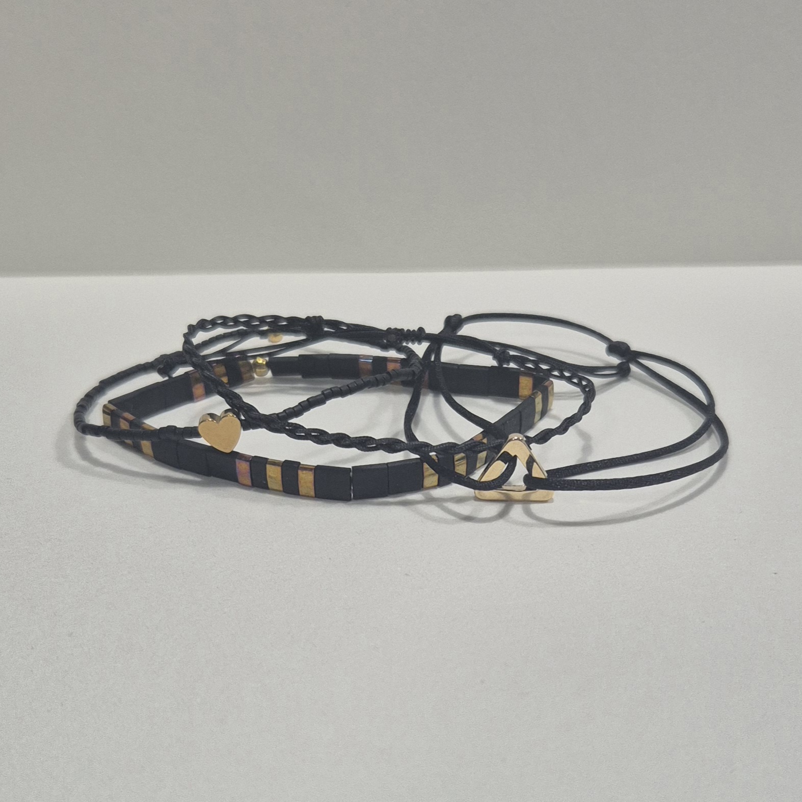 3. náramek – pletený šňůrkový náramek v černé barvě, který dodává setu jemnou texturu.
