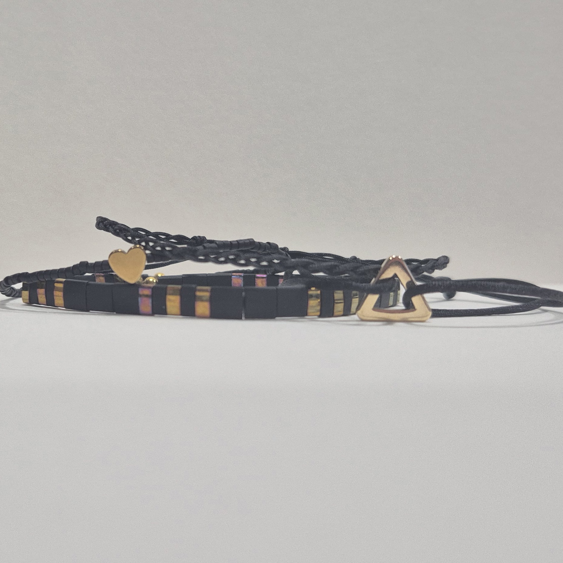 2. náramek – z drobných Miyuki korálků, ozdobený srdíčkem ze syntetického hematitu ve zlatém odstínu.