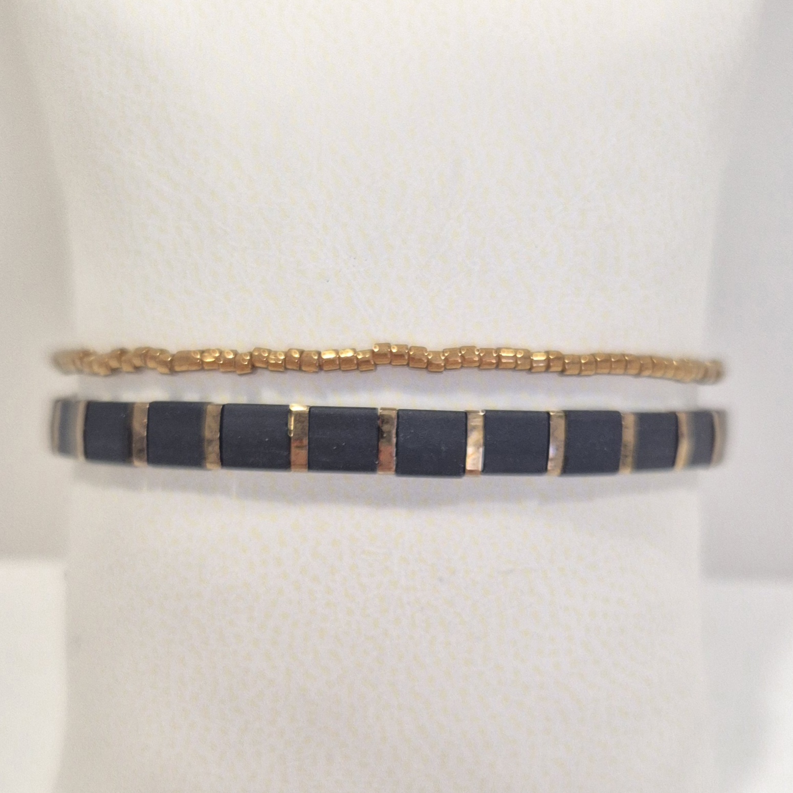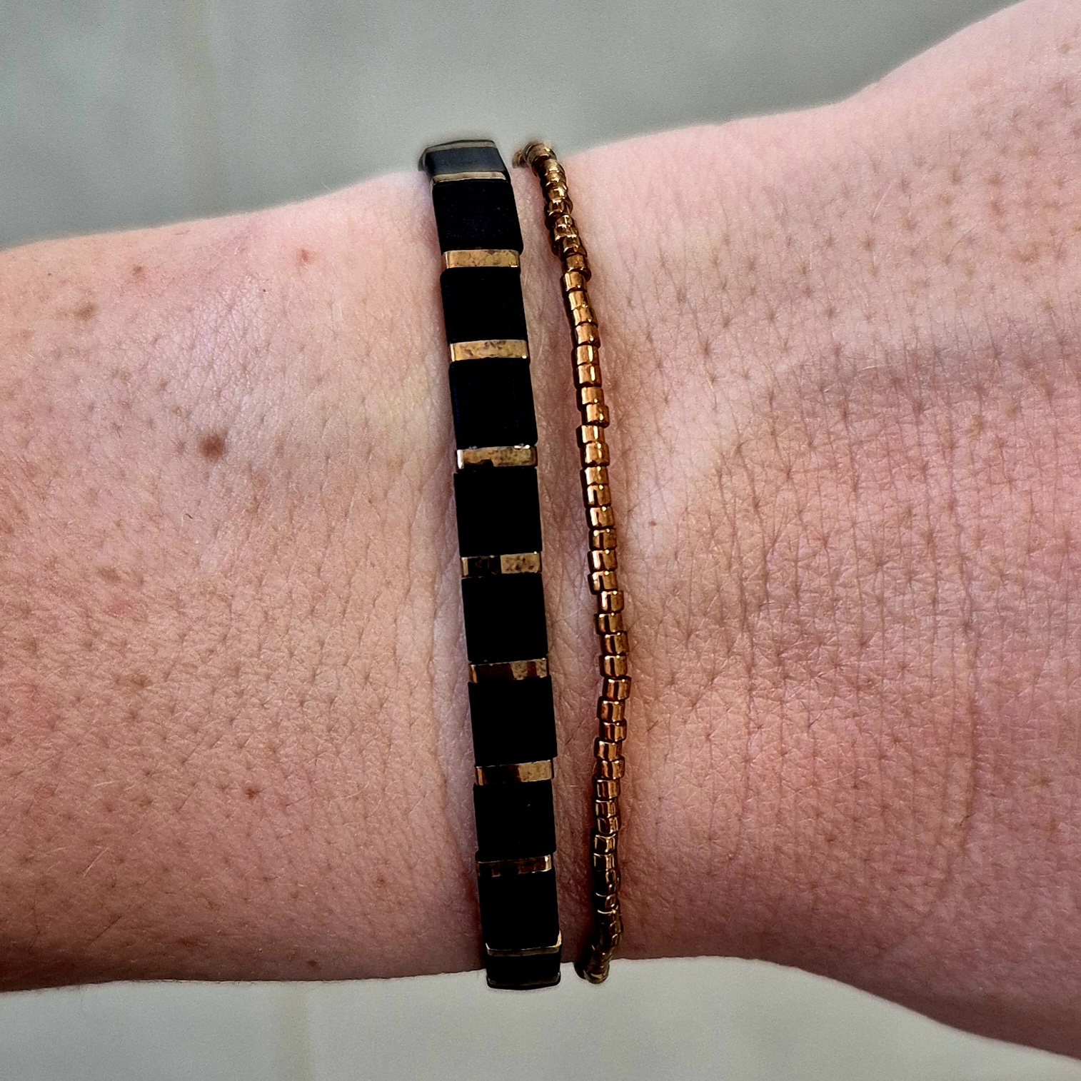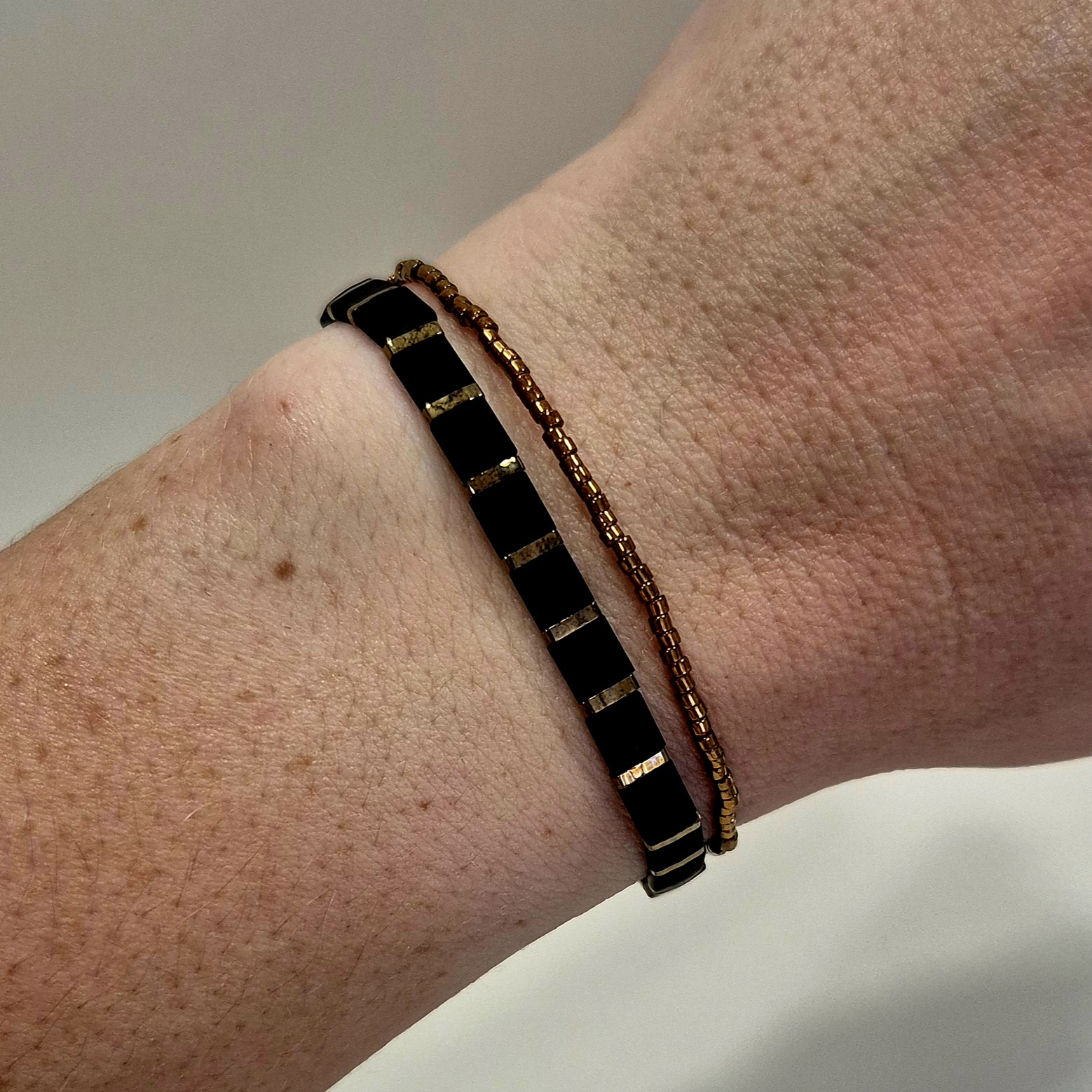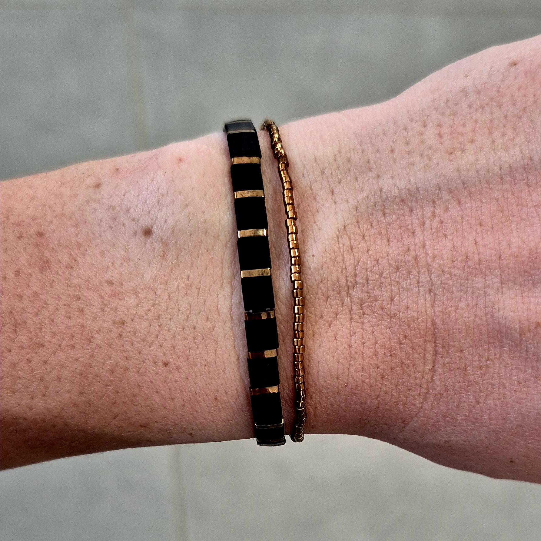 Jeden náramek je tvořen z plochých Miyuki korálků v černo-zlaté kombinaci, druhý z drobných zlatých korálků, které dodávají celku jemný lesk.