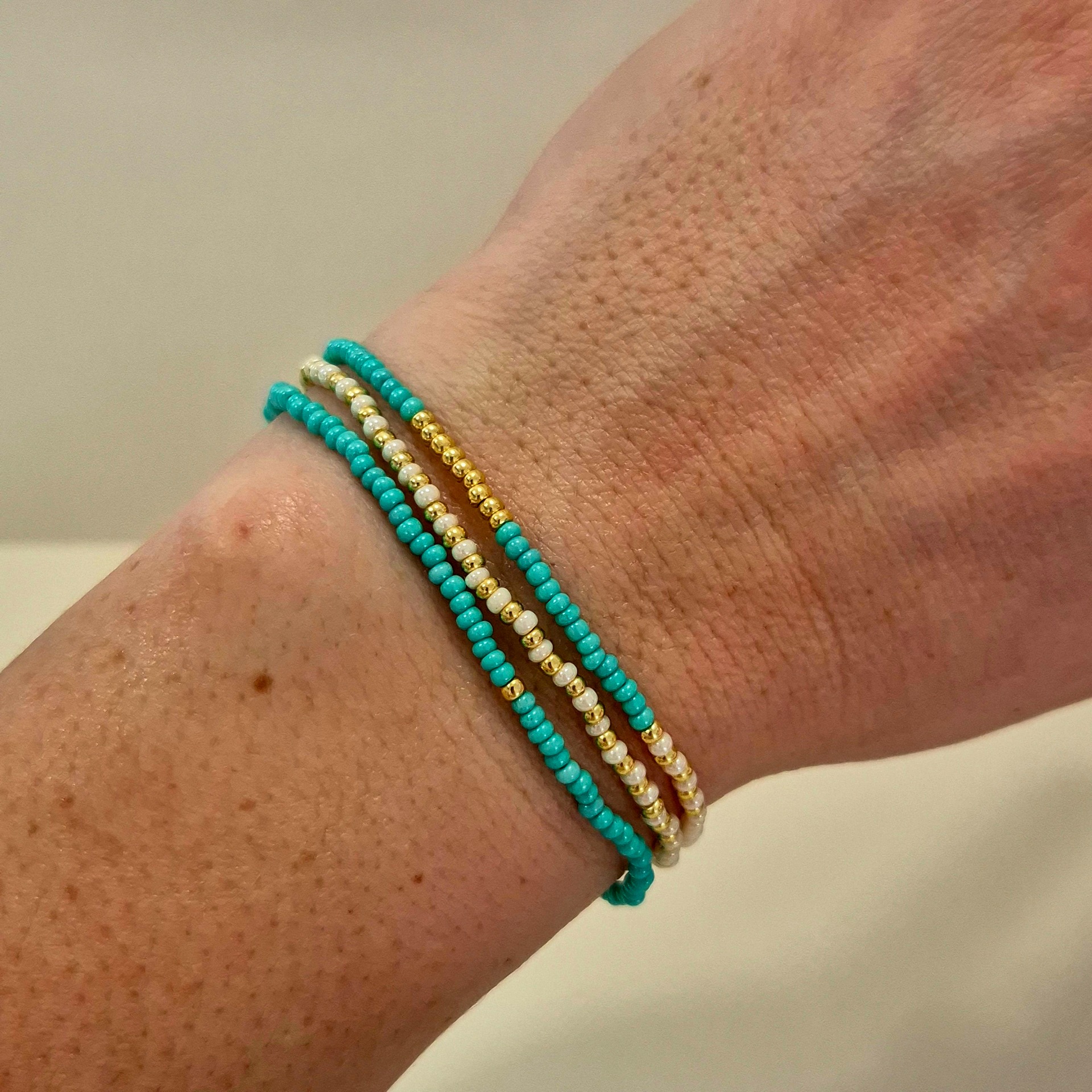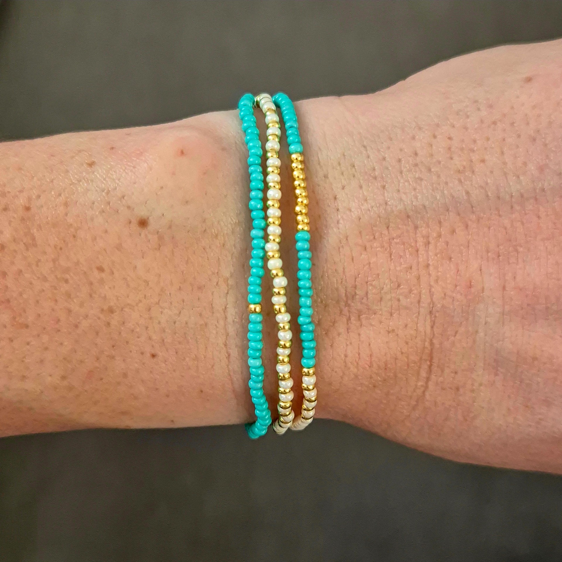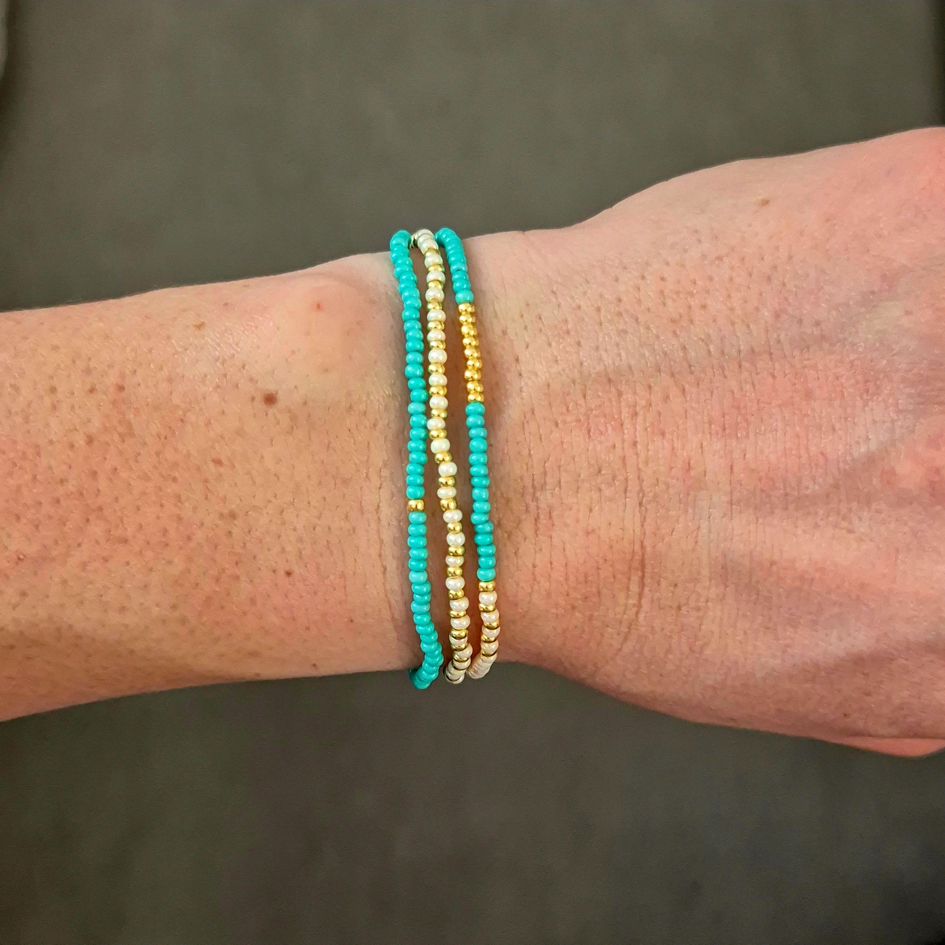 Náramky jsou vyrobené z drobných skleněných korálků, díky kterým působí velmi jemně a elegantně na ruce. Jsou lehké, příjemné na nošení a hodí se jak pro každodenní nošení, tak jako nenápadný doplněk k elegantnějšímu outfitu.