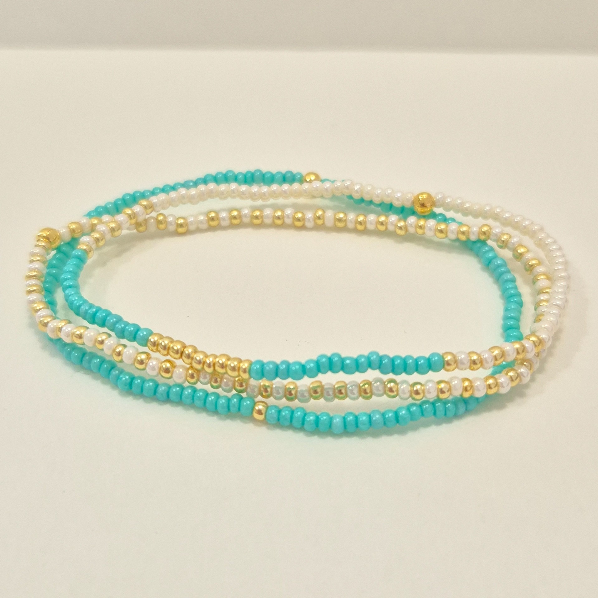 Jemný set tří ručně vyráběných náramků v mentolové, krémové a zlaté kombinaci. Svěží mentolová barva působí lehce a přirozeně, zatímco zlaté detaily dodávají náramkům jemnou eleganci.
