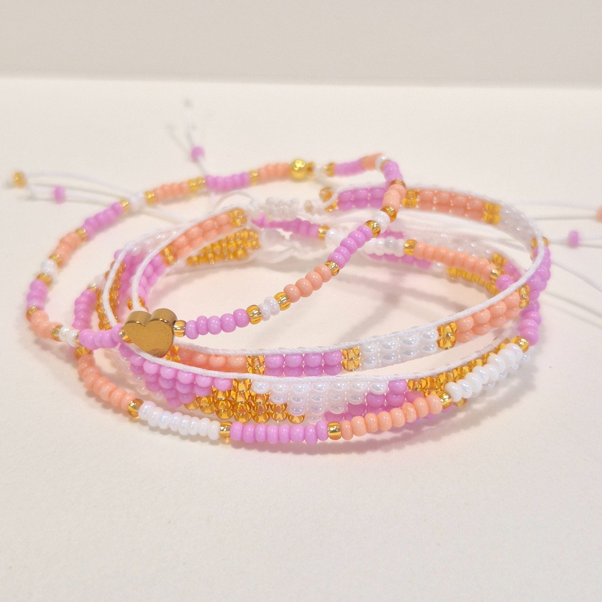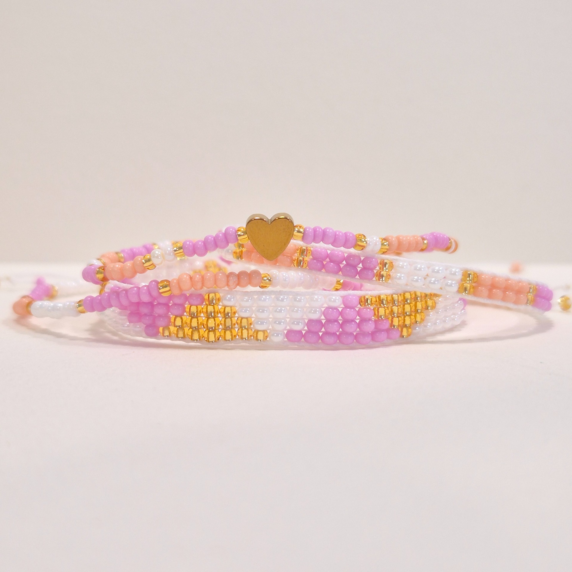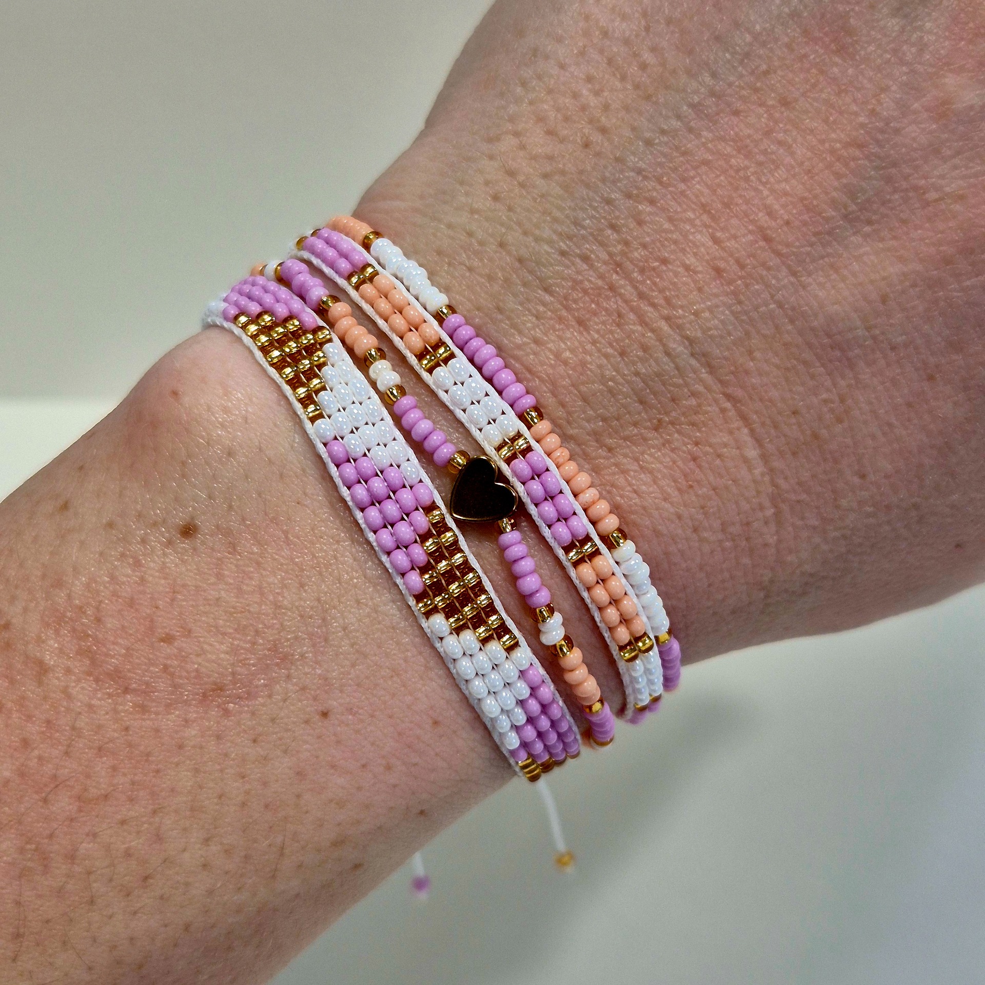 Elegantní kombinace čtyř náramků ze skleněných korálků v odstínech fialové, meruňkové, bílé a zlaté.