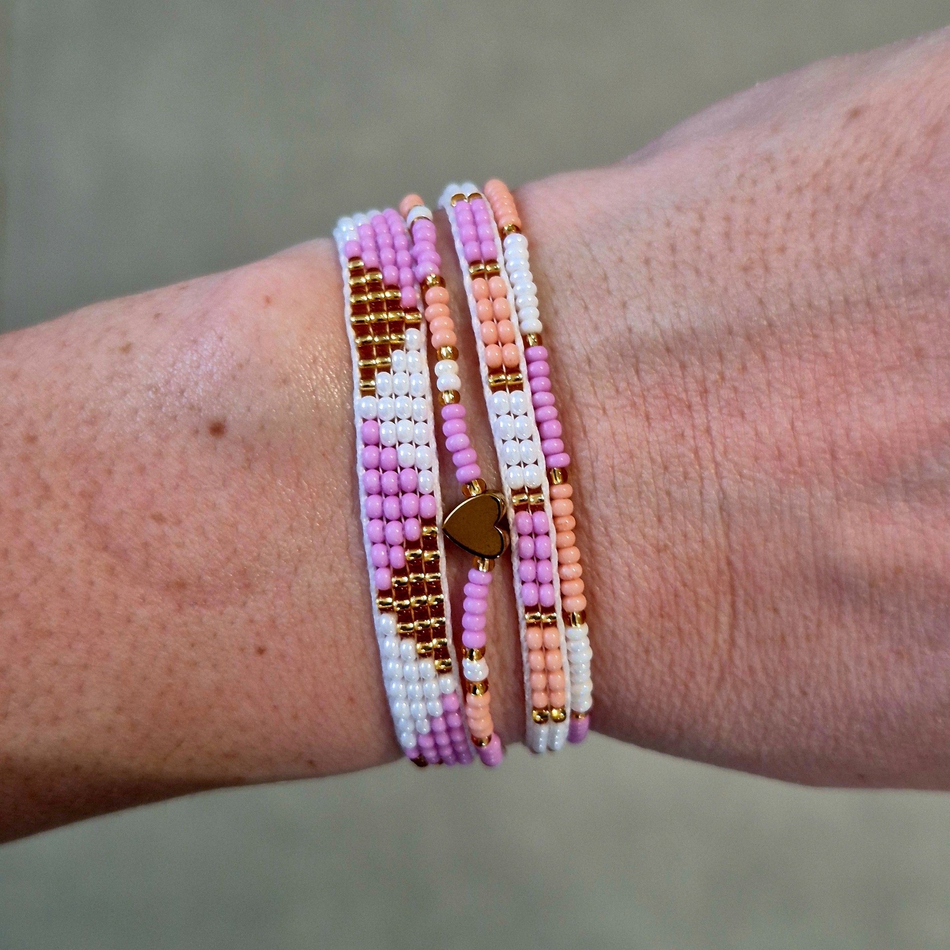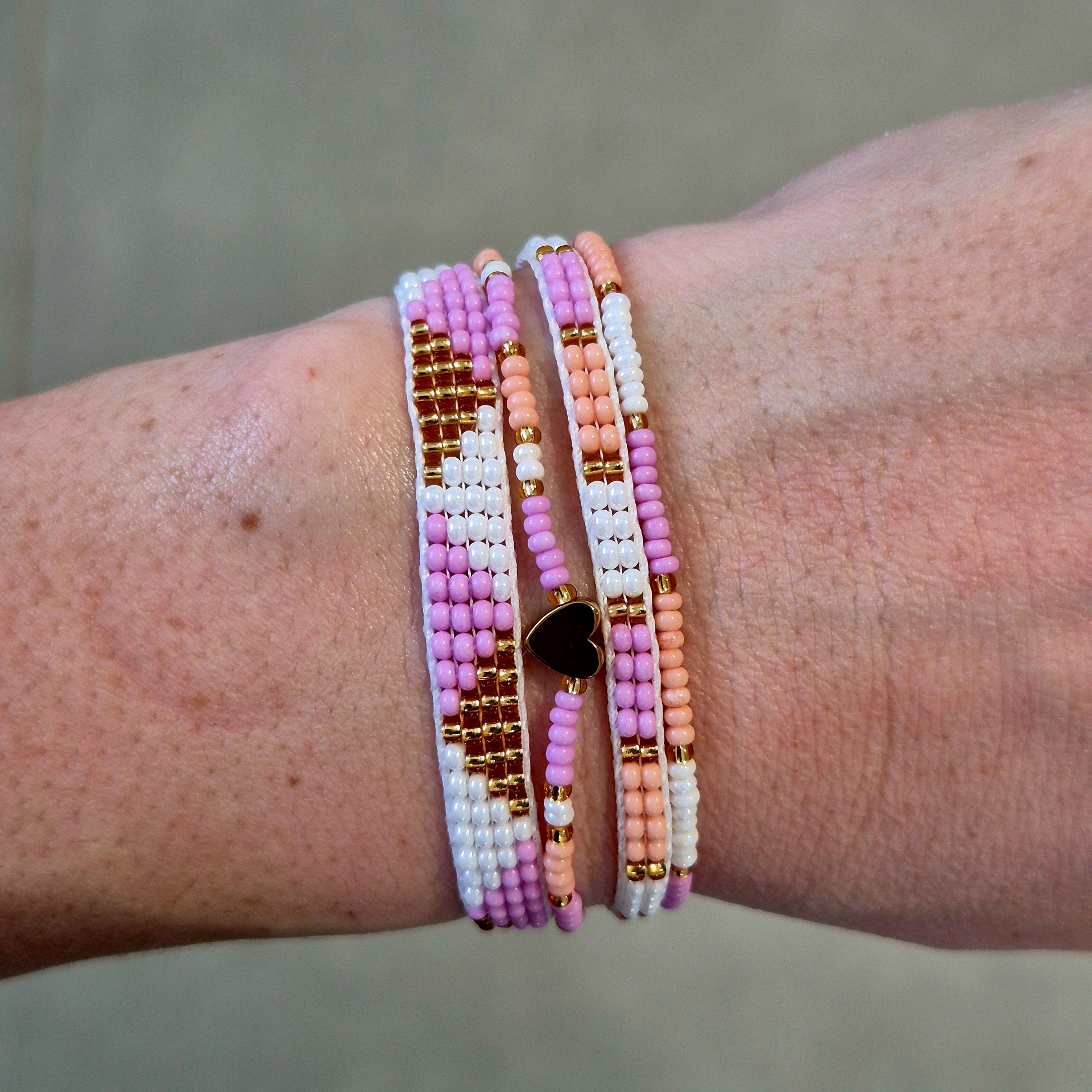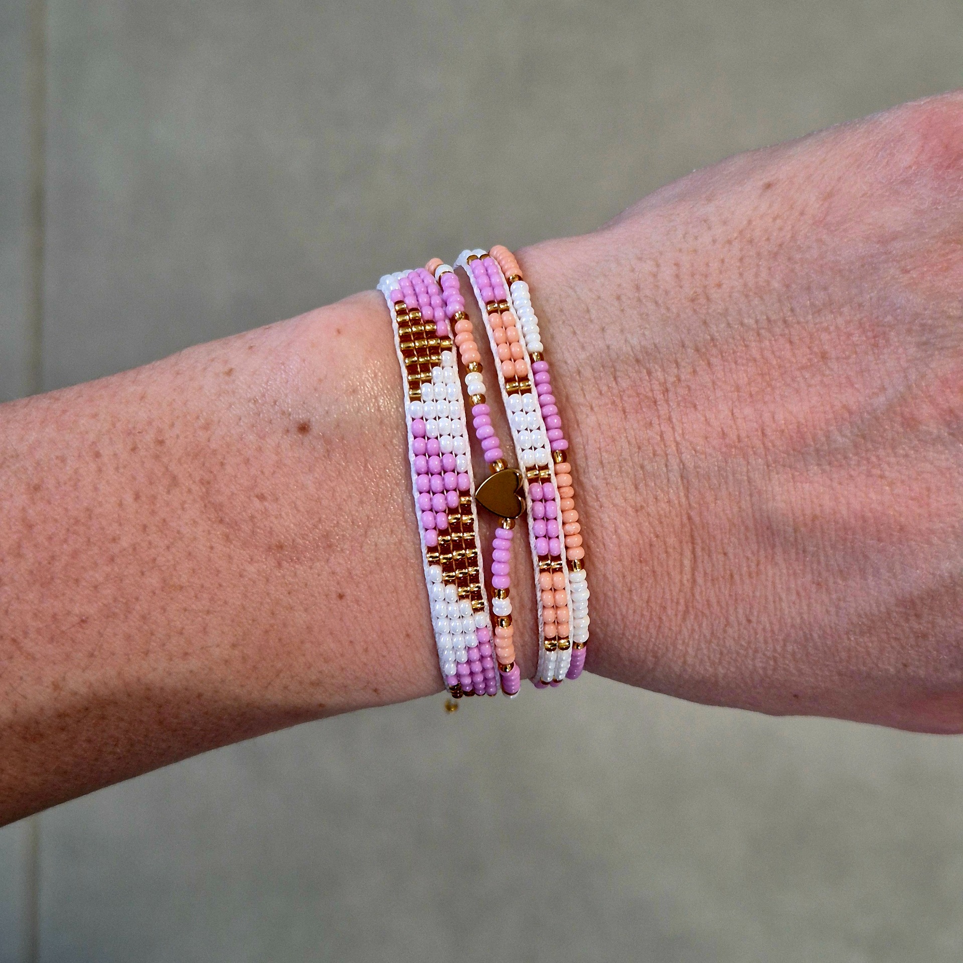 Elegantní kombinace čtyř náramků ze skleněných korálků v odstínech fialové, meruňkové, bílé a zlaté.