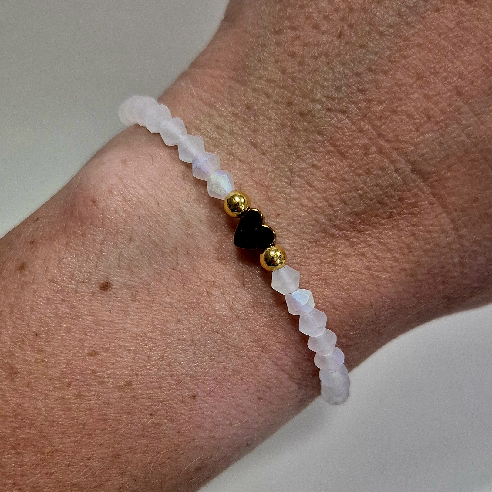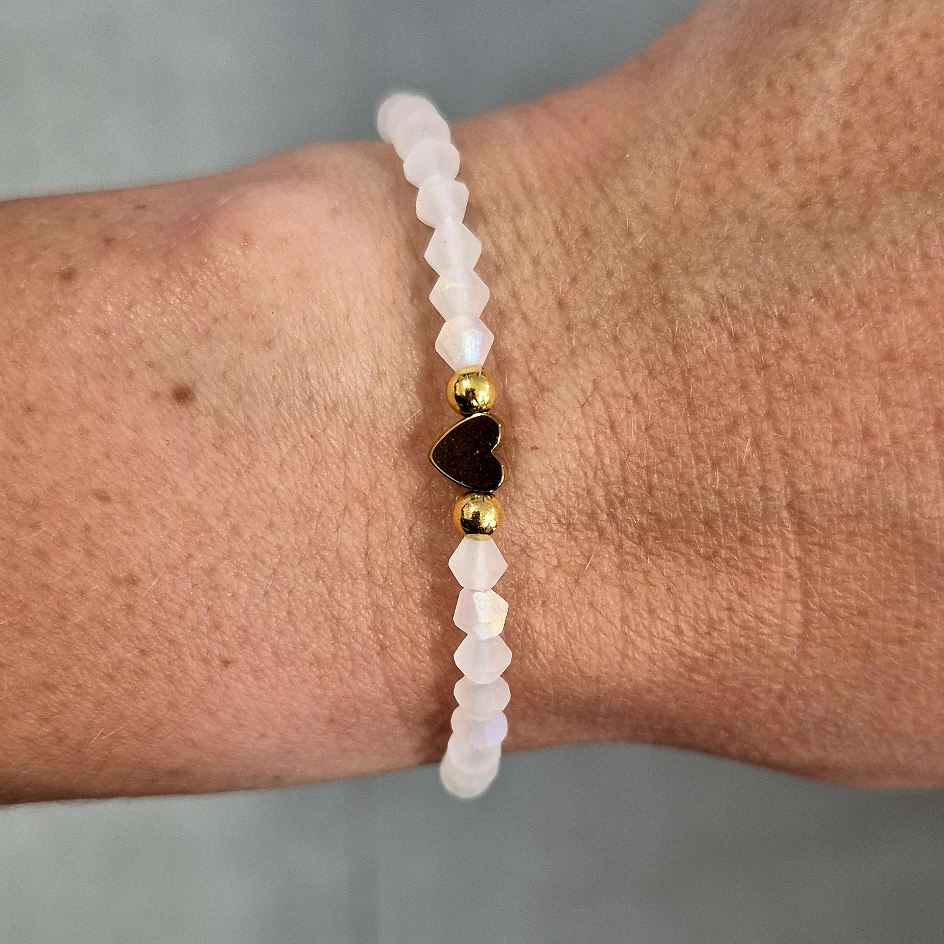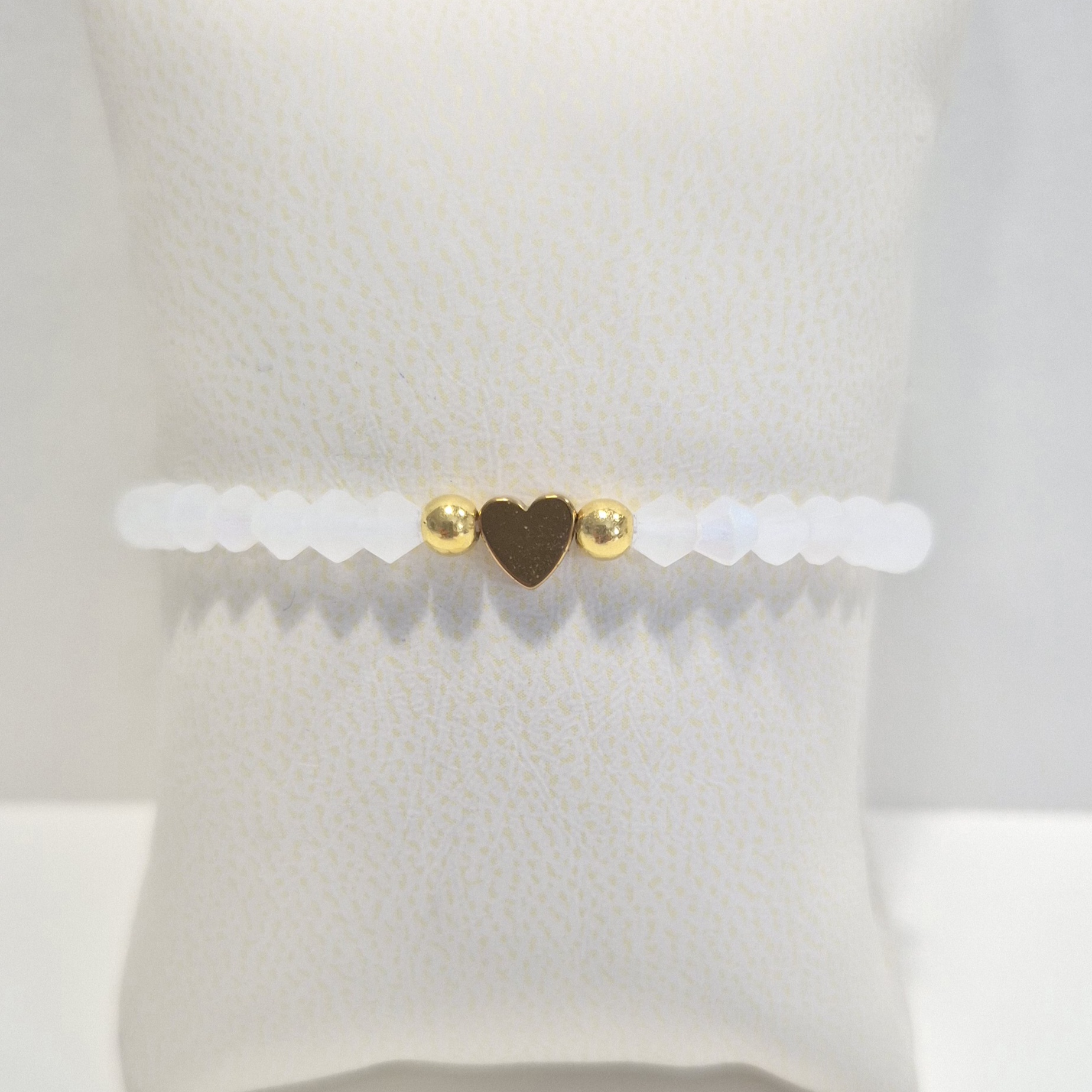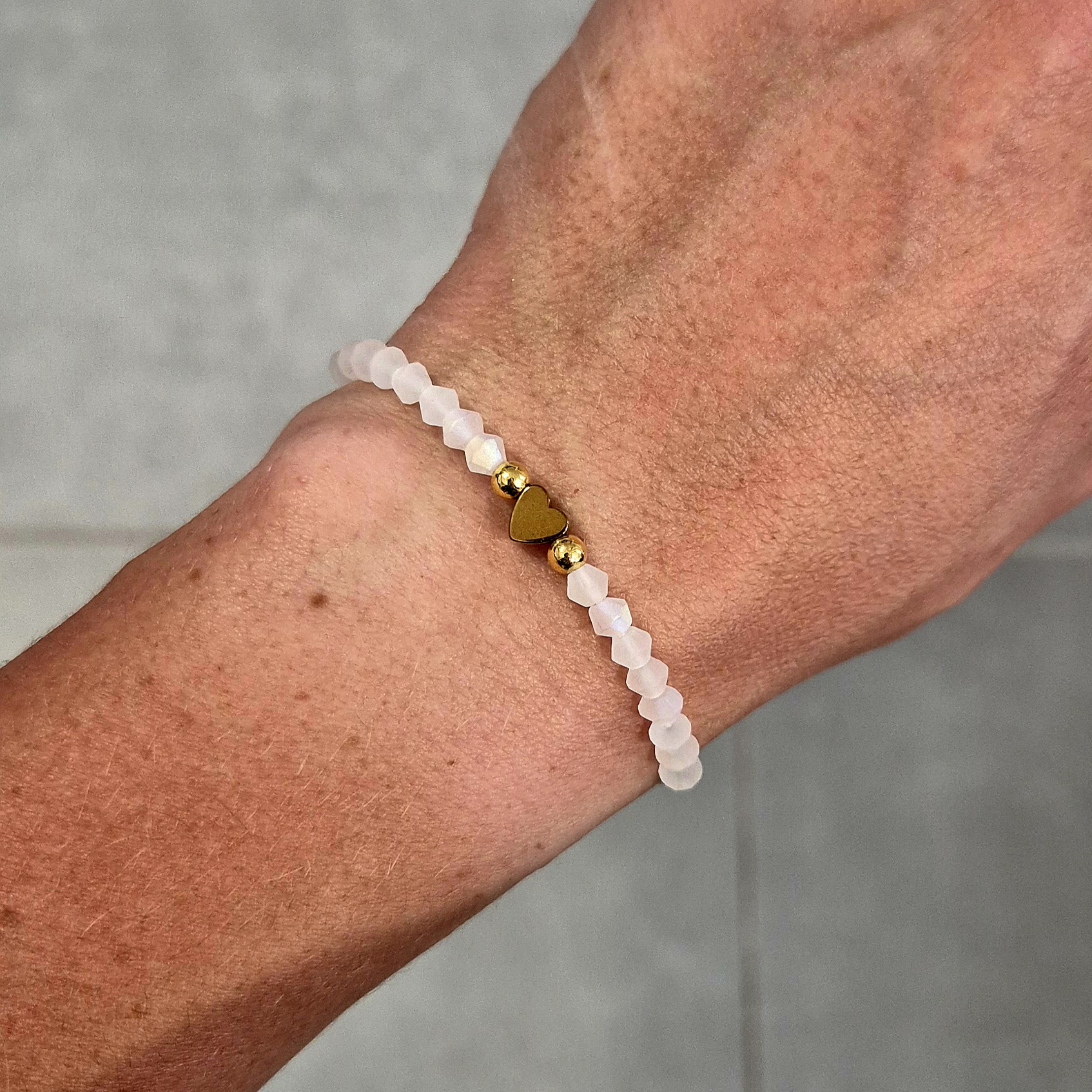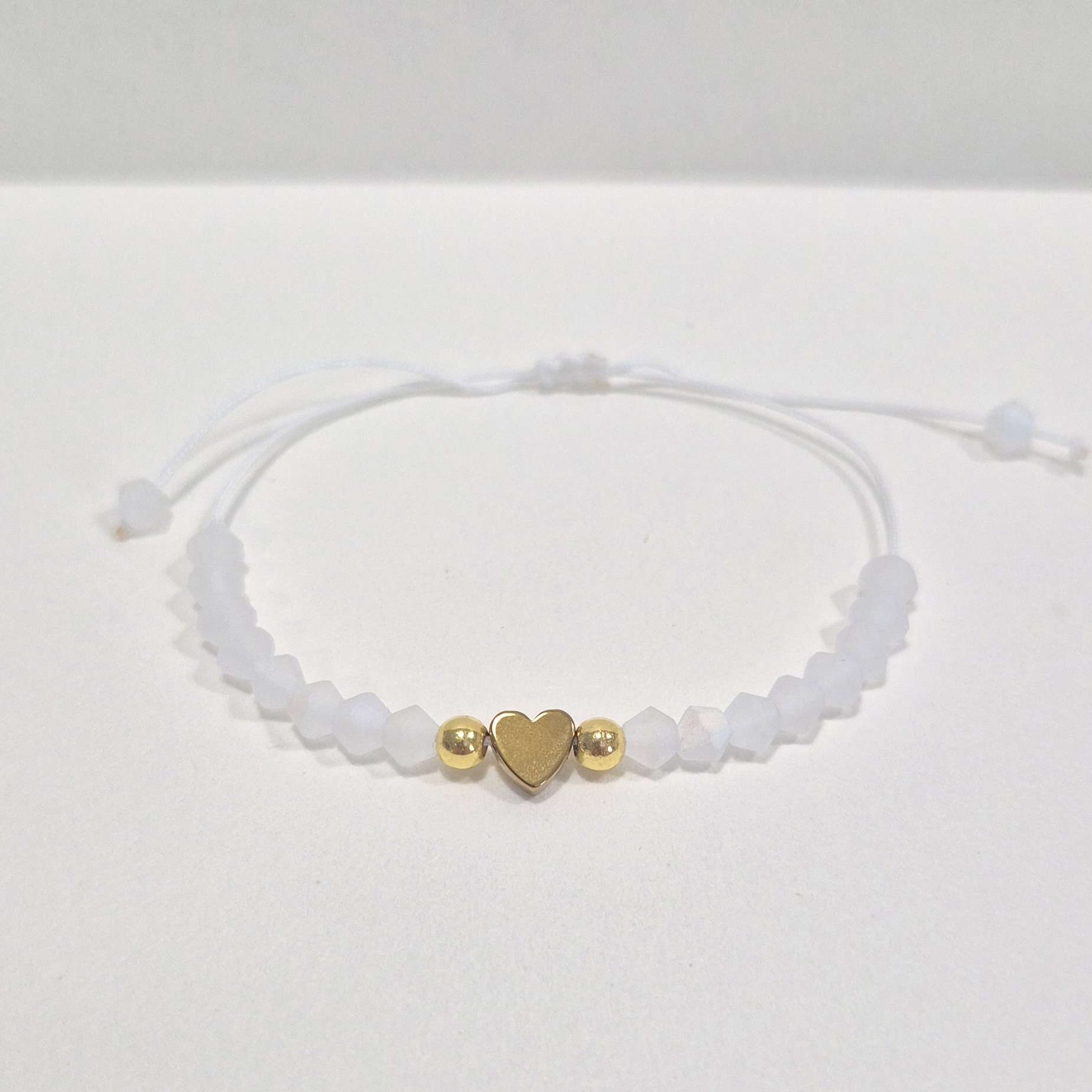 Je zdobený matnými broušenými korálky, které působí decentně a zároveň moderně. Střed náramku tvoří zlaté srdíčko ze syntetického hematitu – symbol lásky a harmonie.