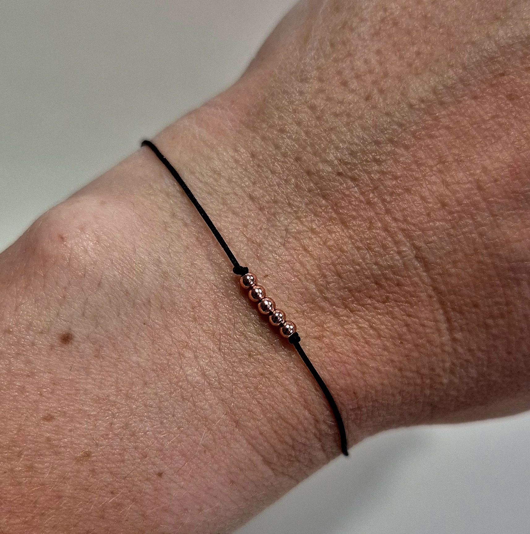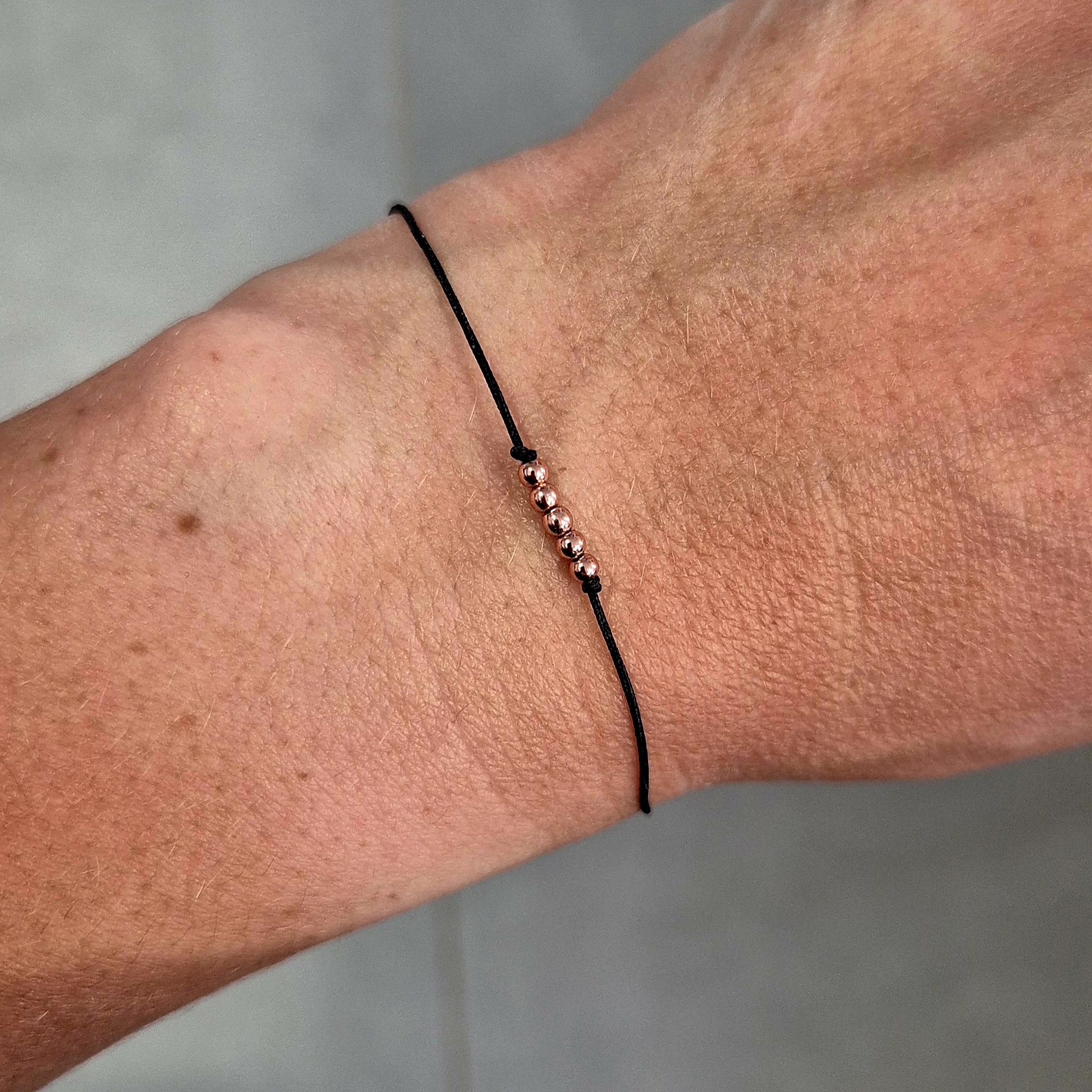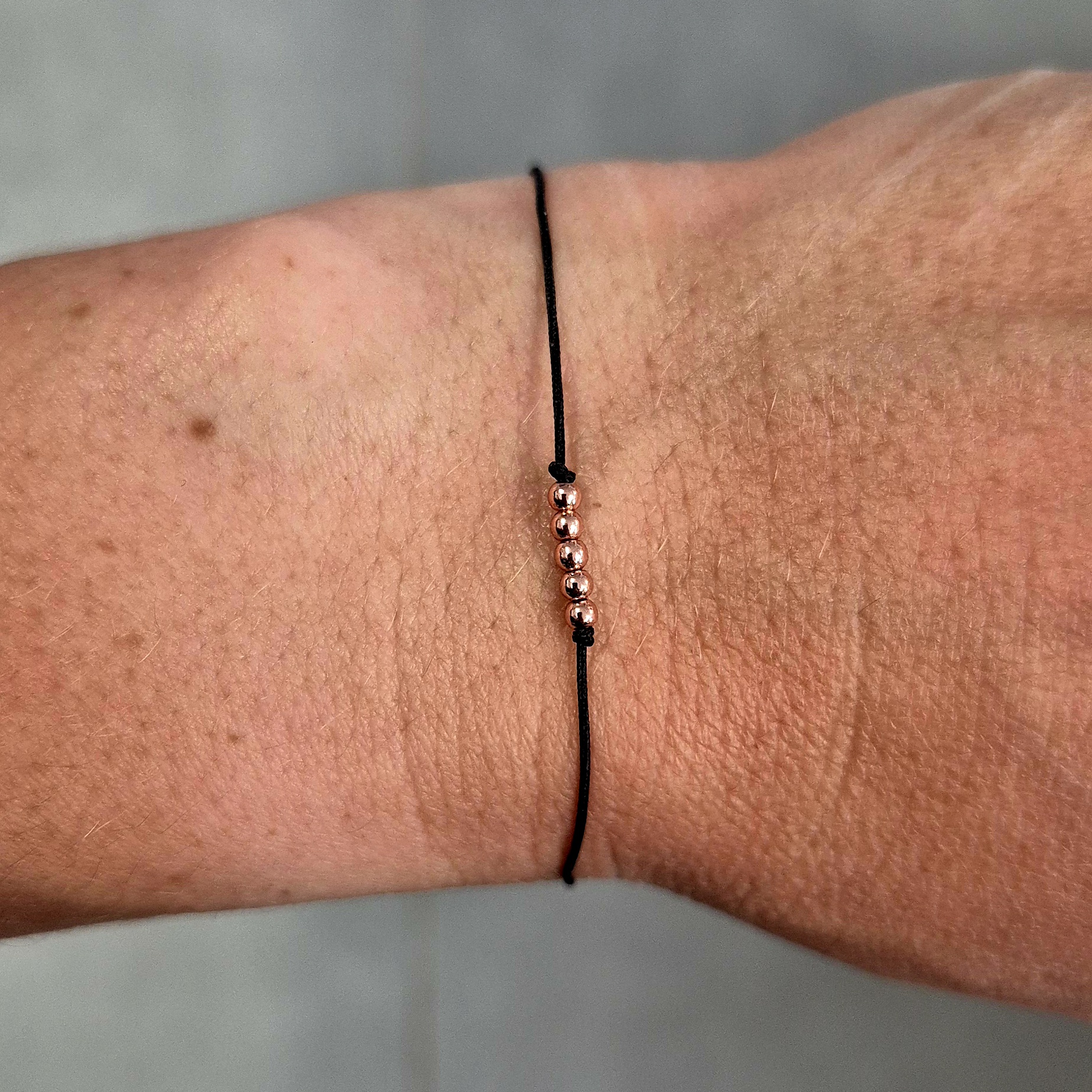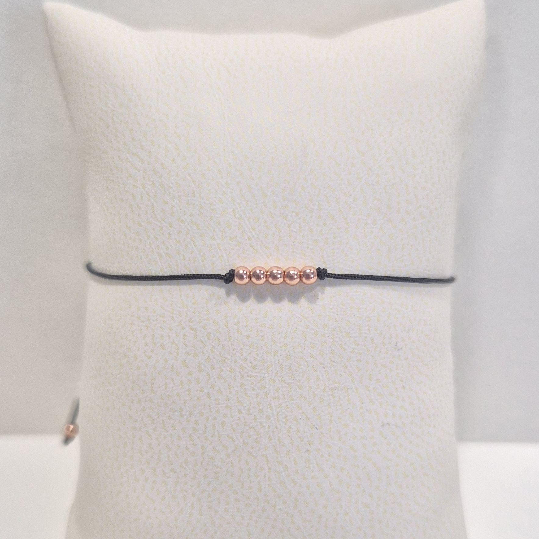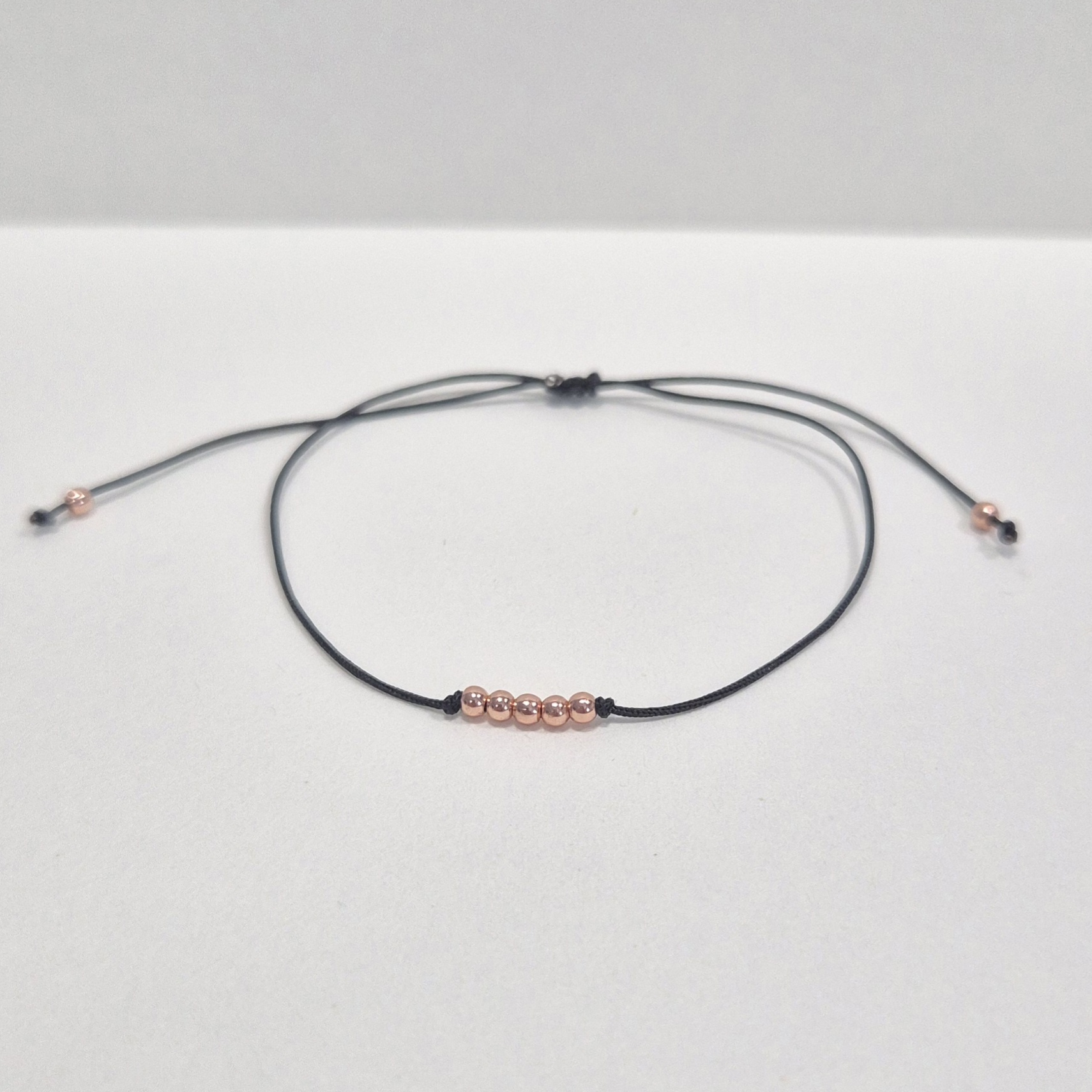 Minimalistický šňůrkový náramek v kombinaci černé polyesterové šňůrky a drobných korálků v barvě rose gold.