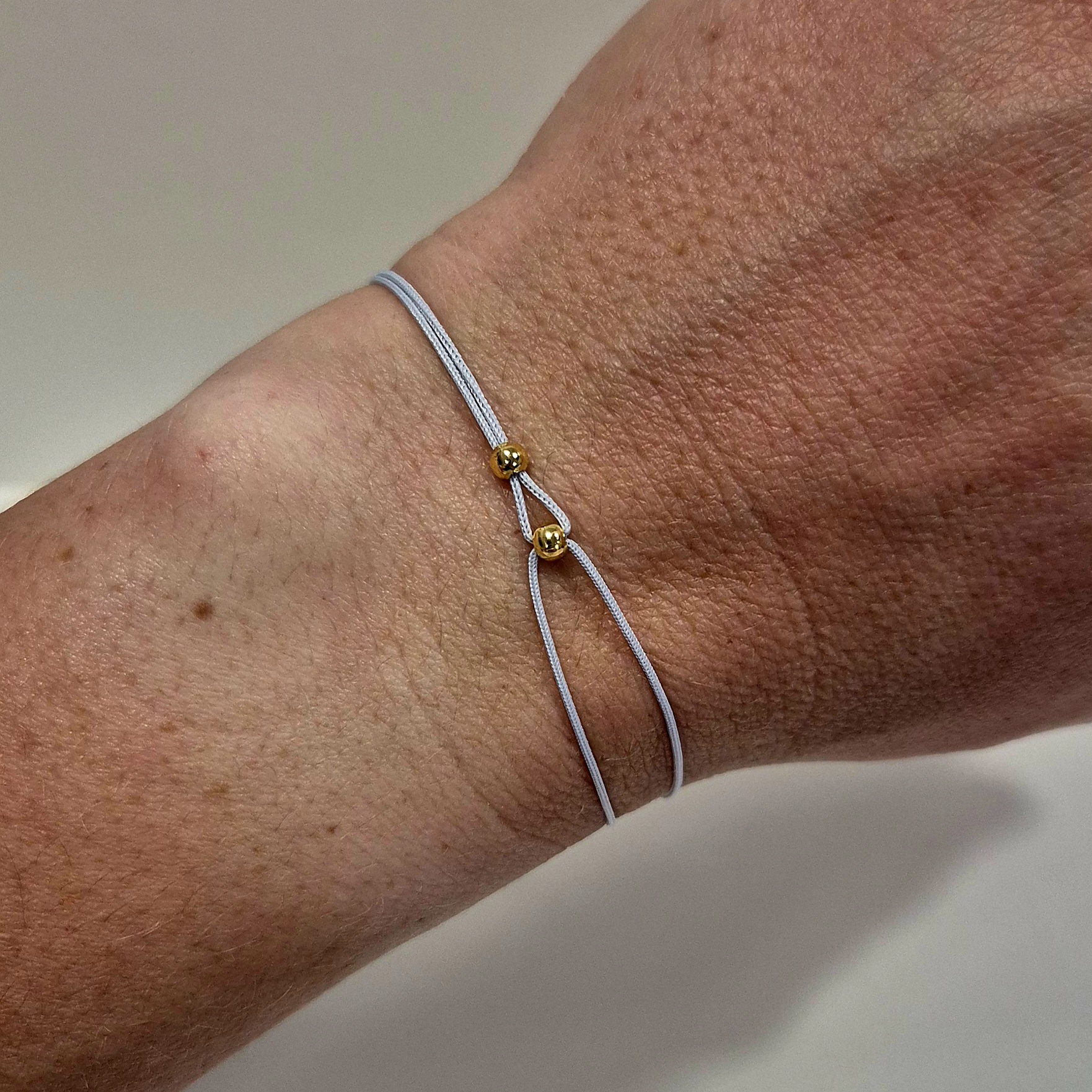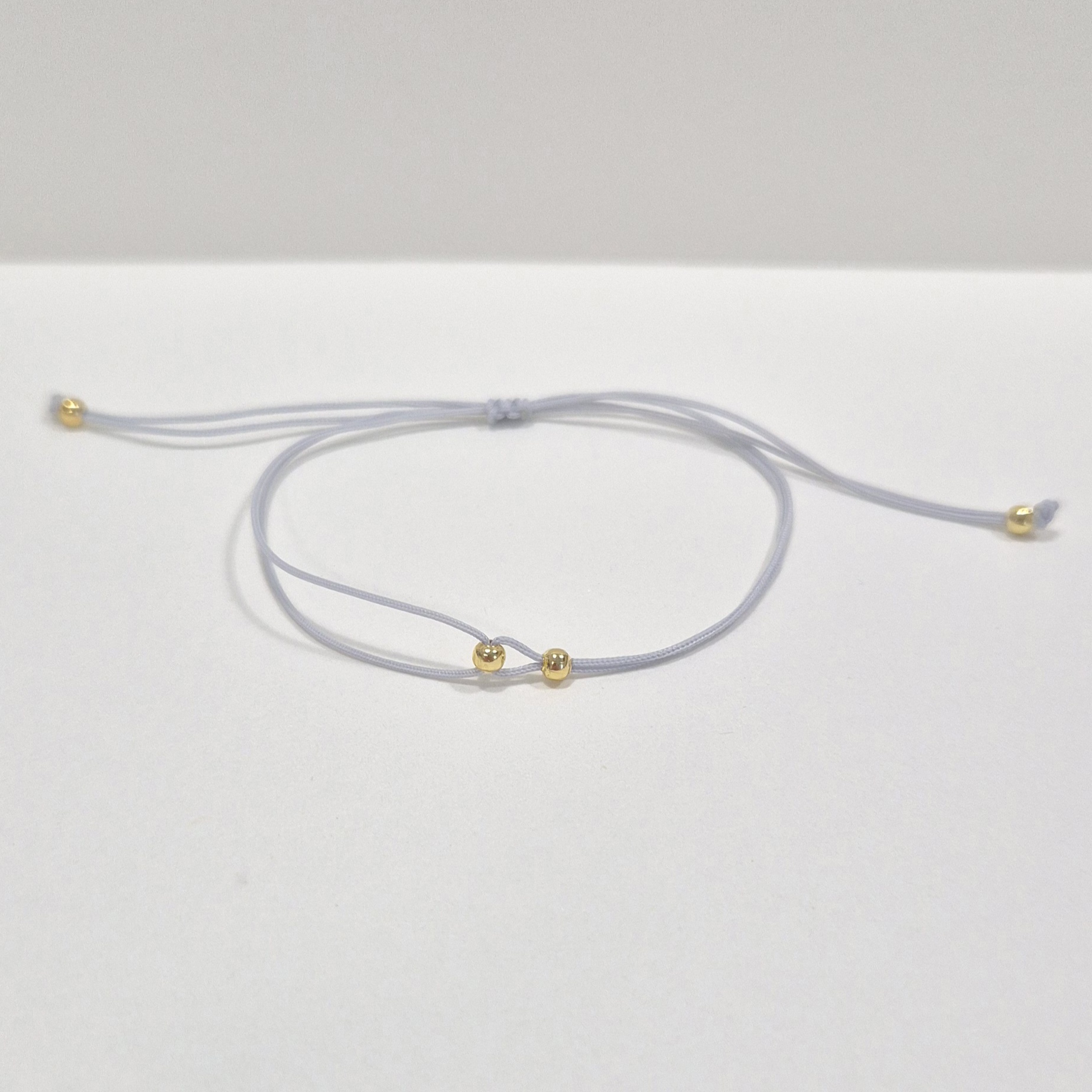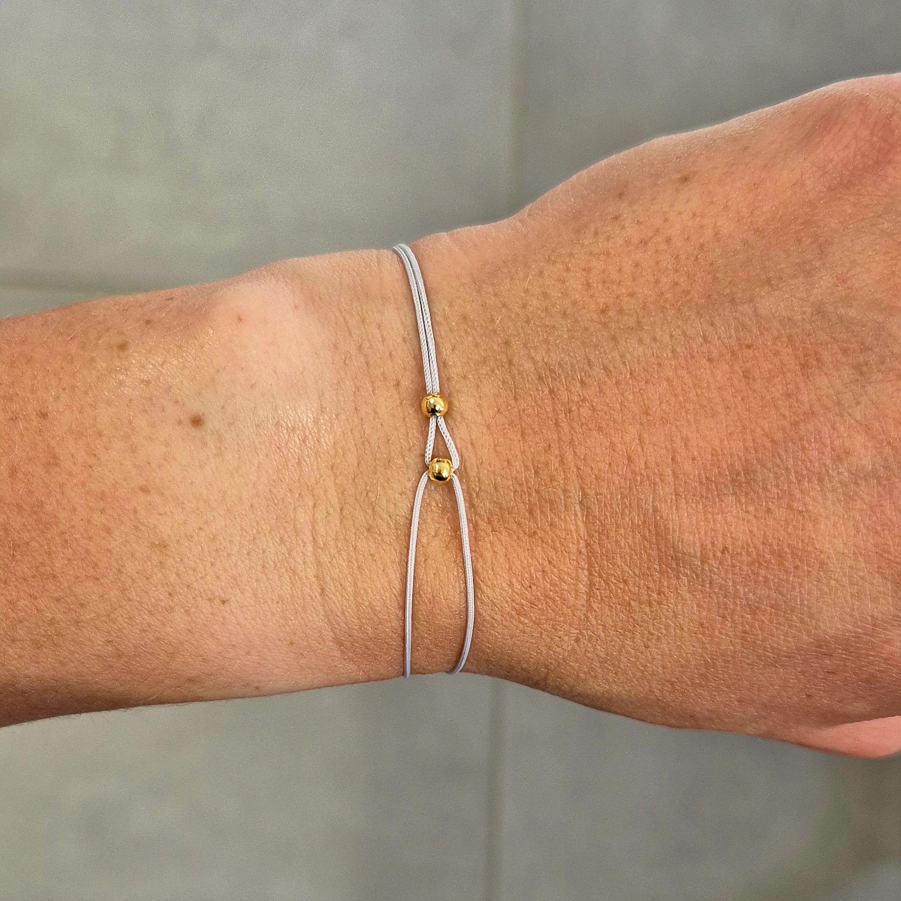 Elegantní šňůrkový náramek v šedé barvě je zdobený jemnými korálky ve zlatém odstínu. Díky tomu působí decentně, ale přitom výrazně a nadčasově.