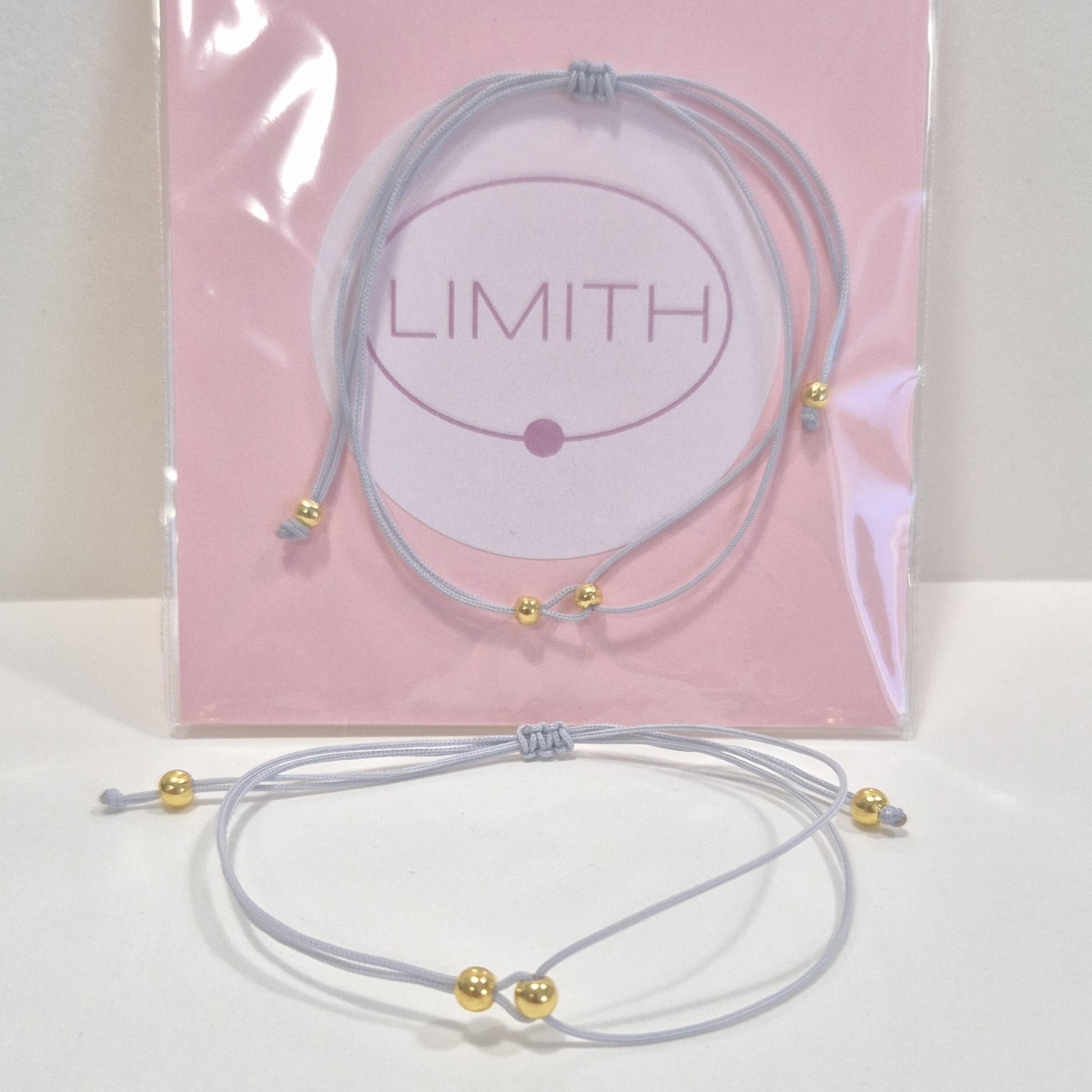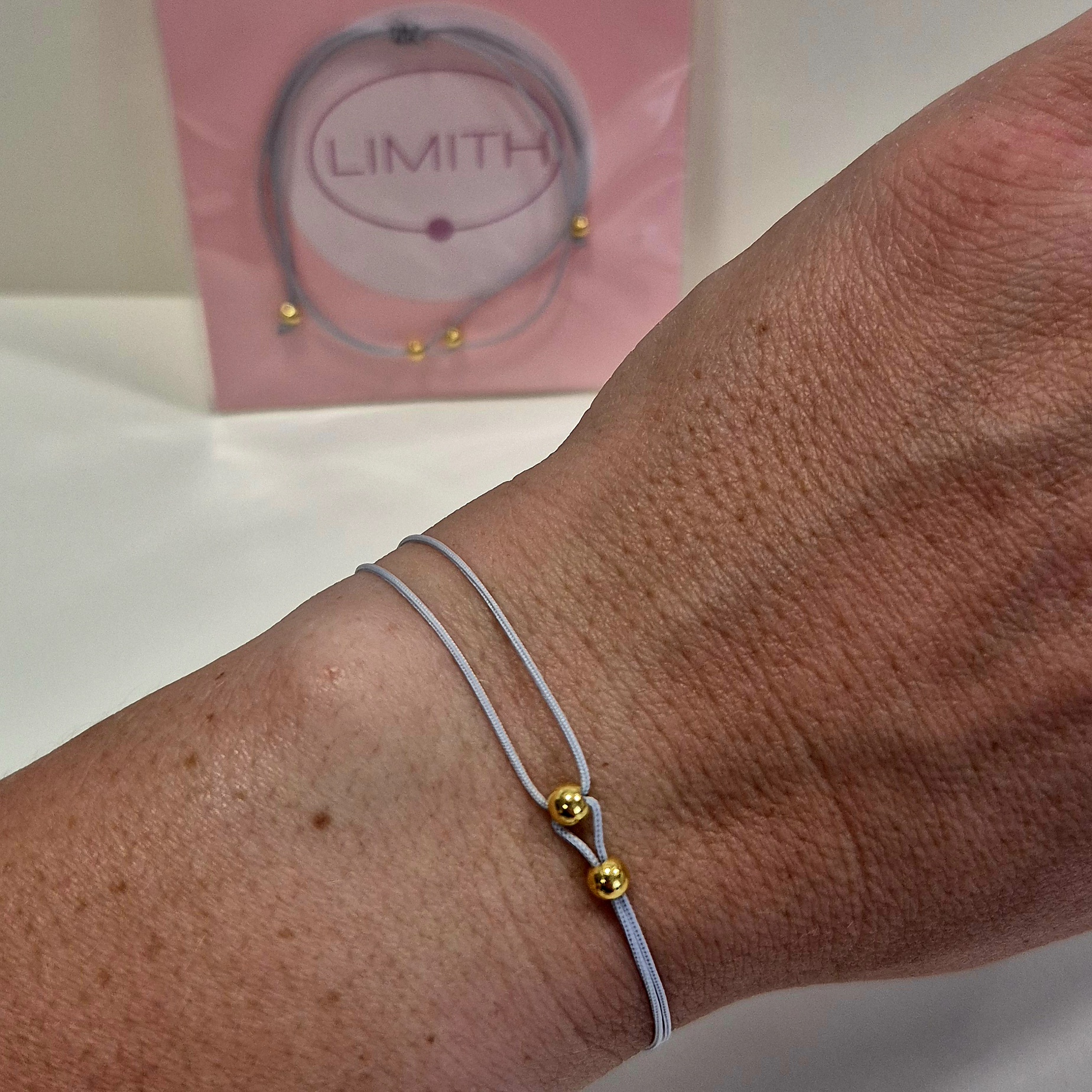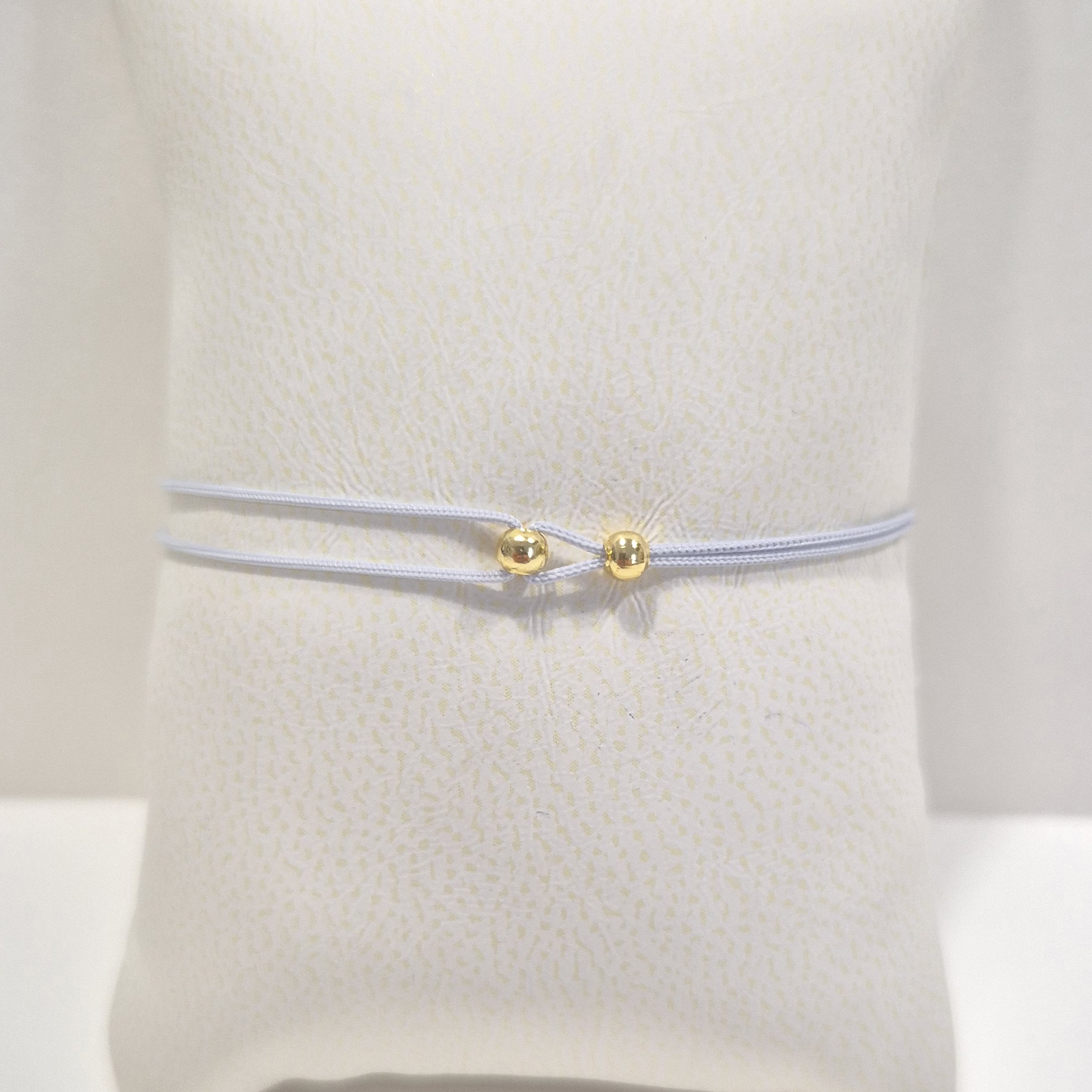 Elegantní šňůrkový náramek v šedé barvě je zdobený jemnými korálky ve zlatém odstínu. Díky tomu působí decentně, ale přitom výrazně a nadčasově.