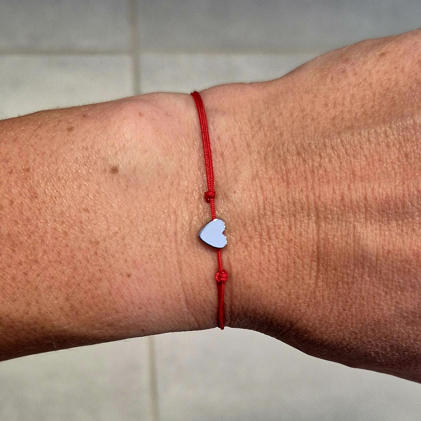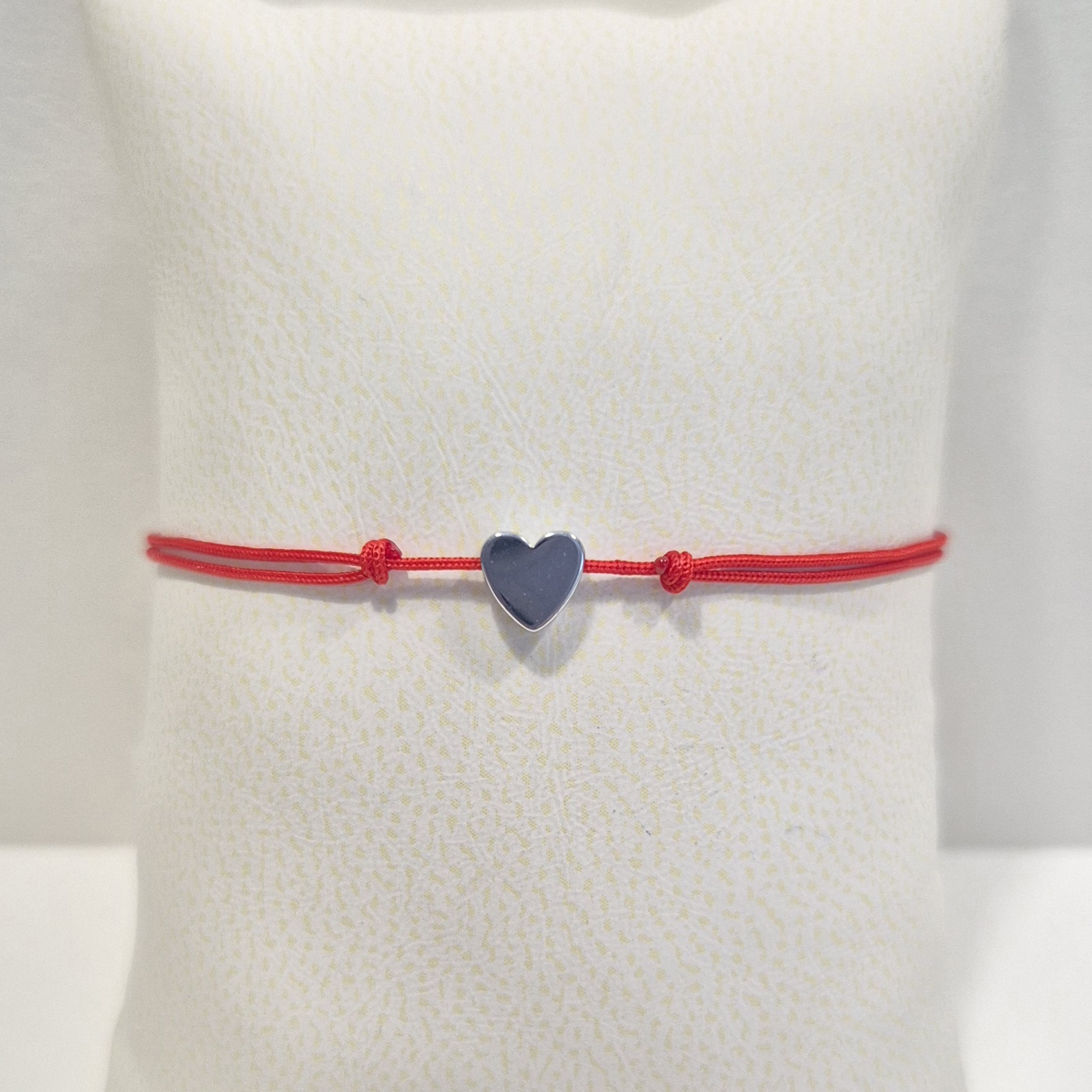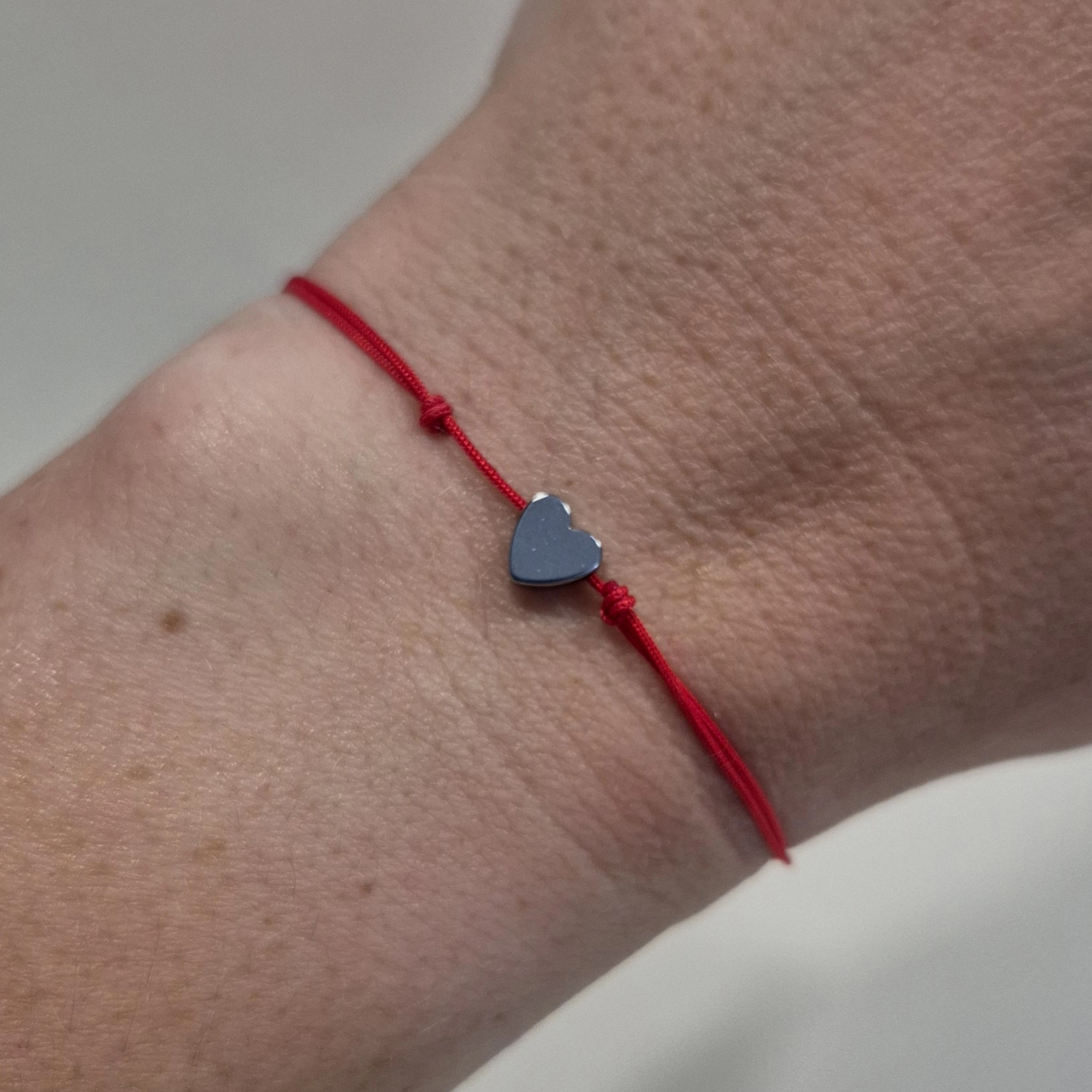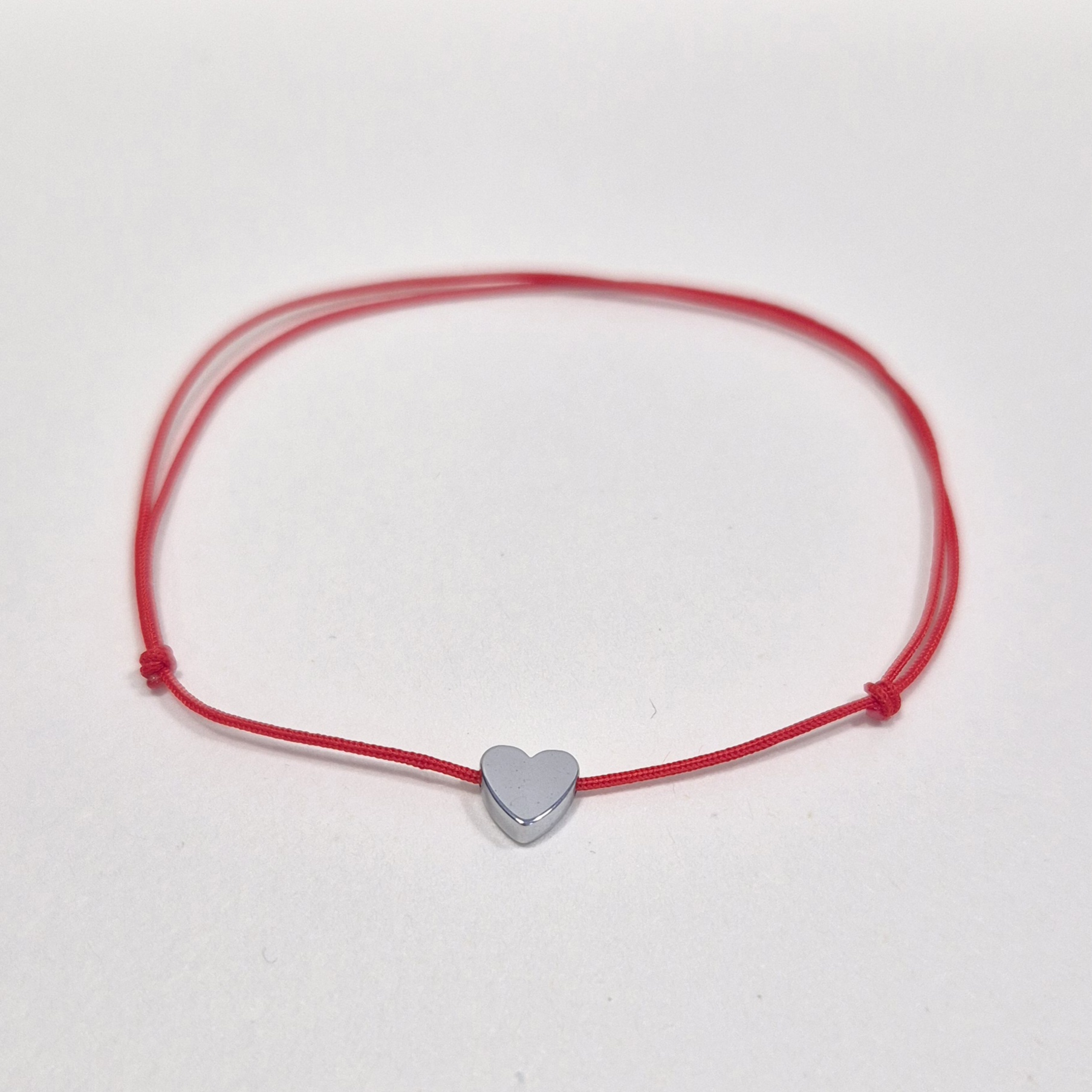 - ručně vyrobený šňůrkový náramek v červené barvě uprostřed zdobený srdíčkem ze syntetického hematitu.