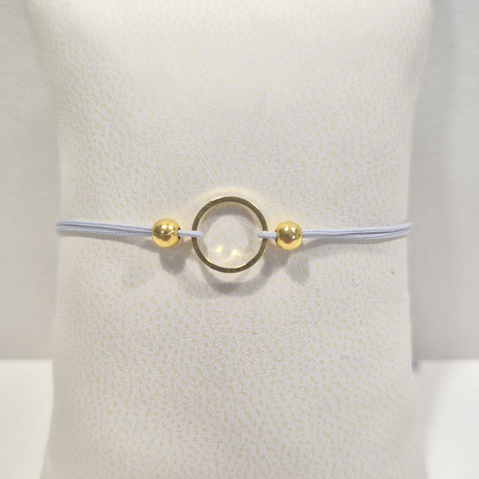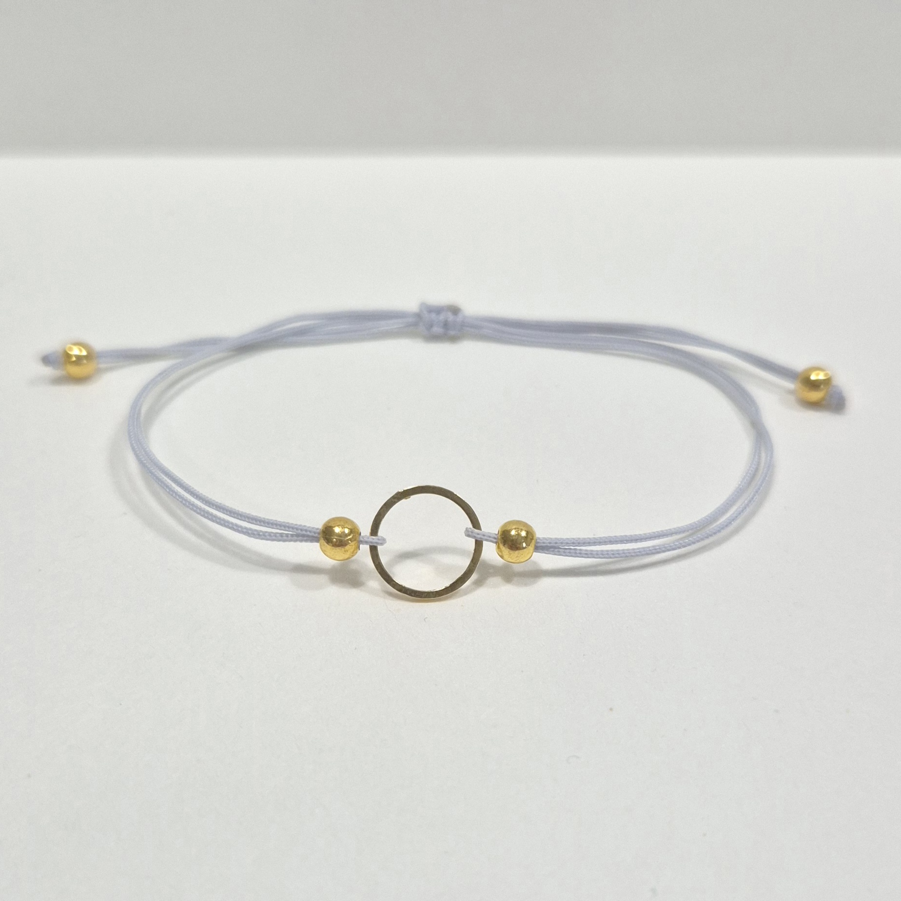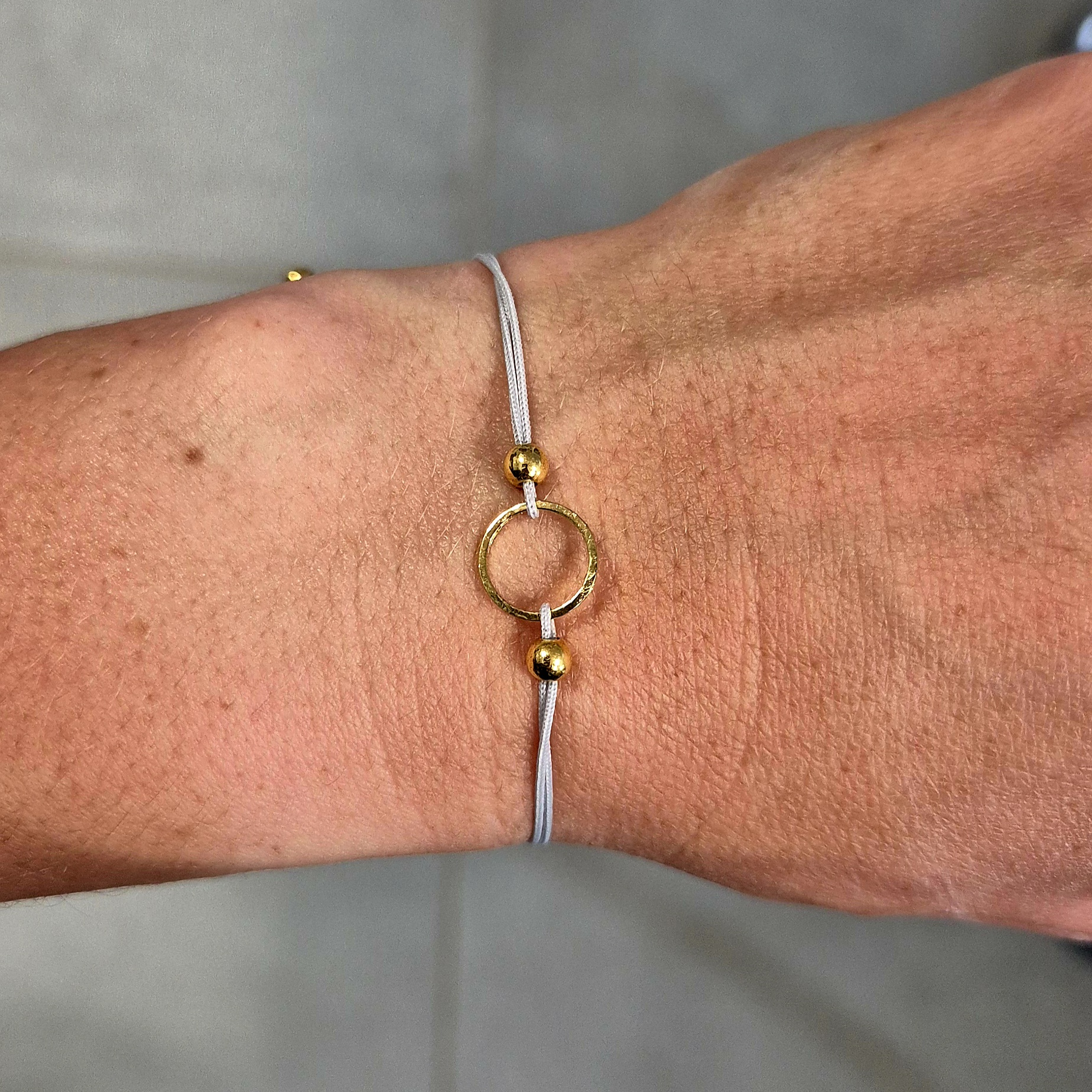 Elegantní šňůrkový náramek v šedé barvě je zdobený jemnými korálky a kroužkem ve zlatém odstínu. Díky tomu působí decentně, ale přitom výrazně a nadčasově.