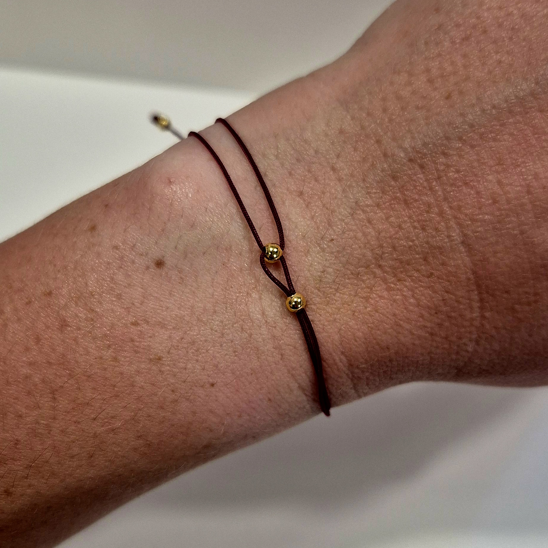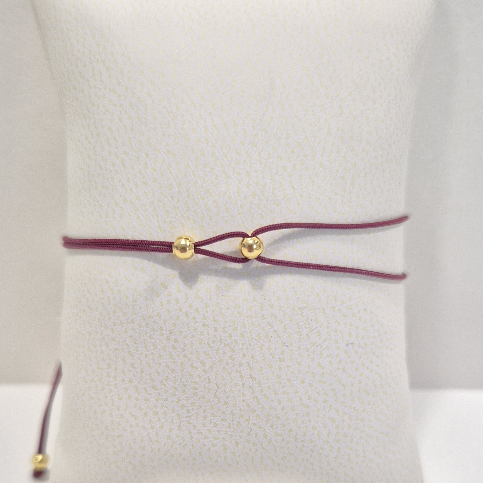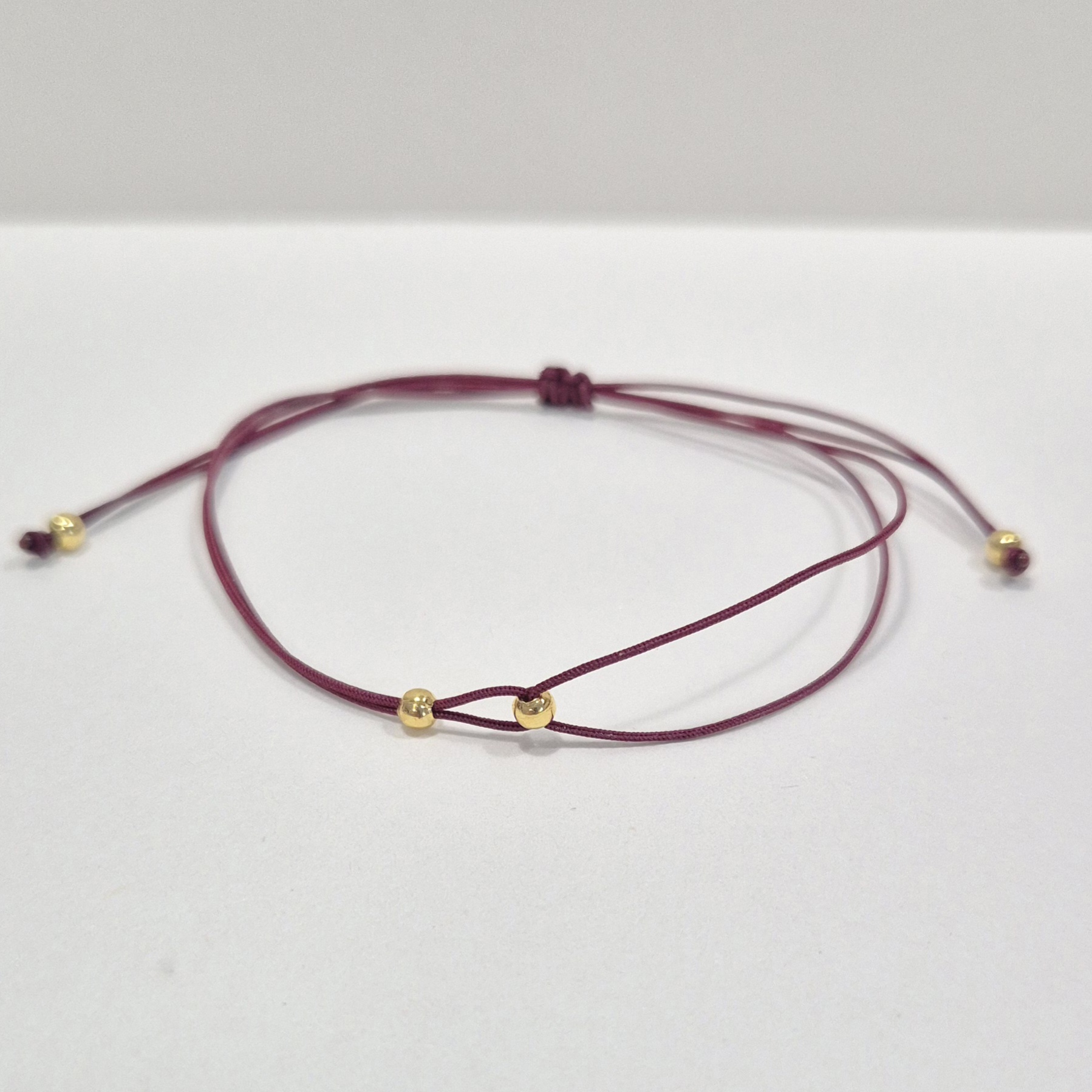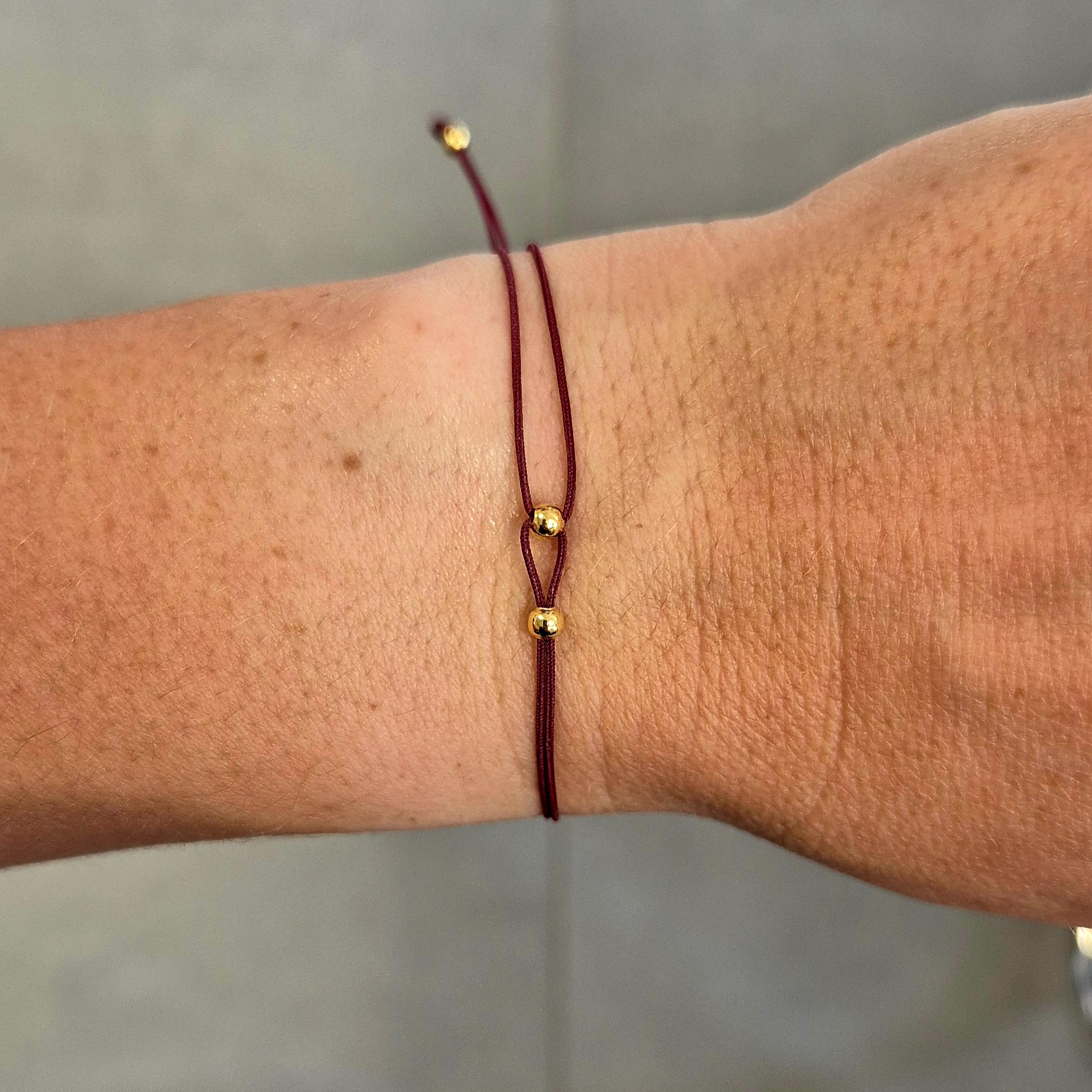 Elegantní šňůrkový náramek ve vínové barvě je zdobený jemnými korálky ve zlatém odstínu. Díky tomu působí decentně, ale přitom výrazně a nadčasově.