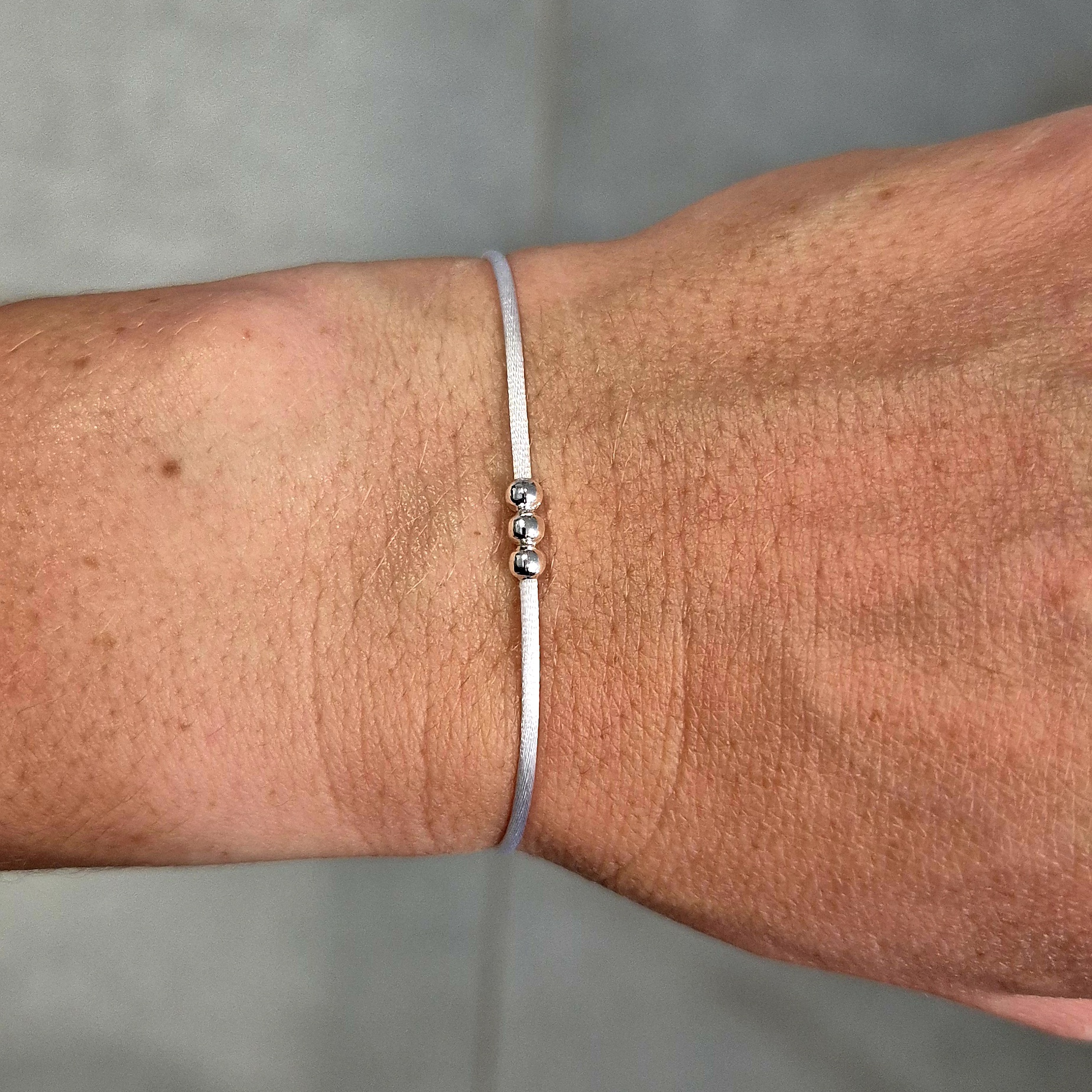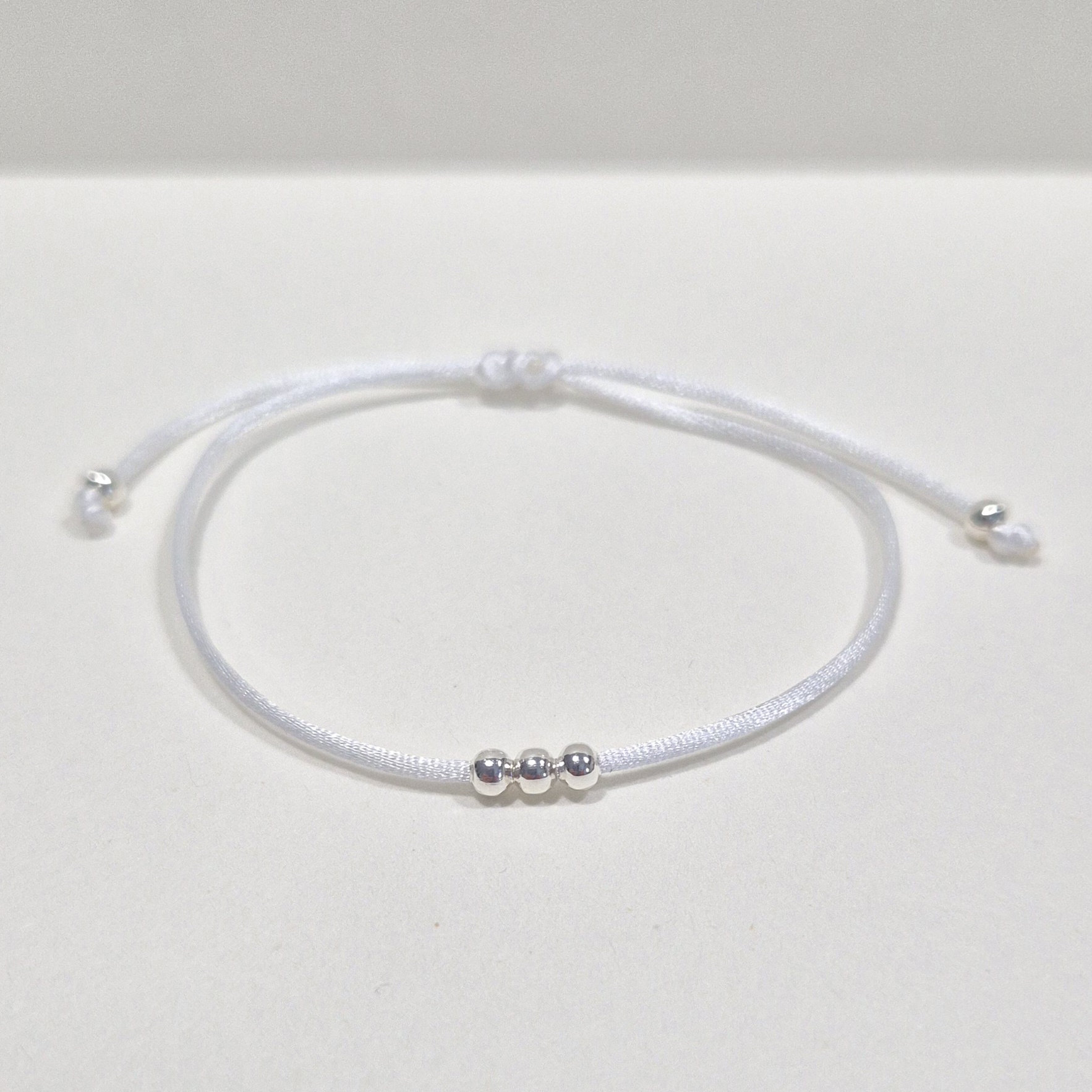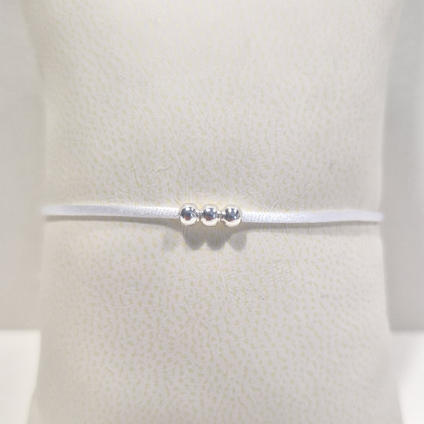 Tento náramek je vyroben z bílé saténové šňůrky, na které jsou navlečené korálky z bižuterního kovu ve stříbrné barvě.
