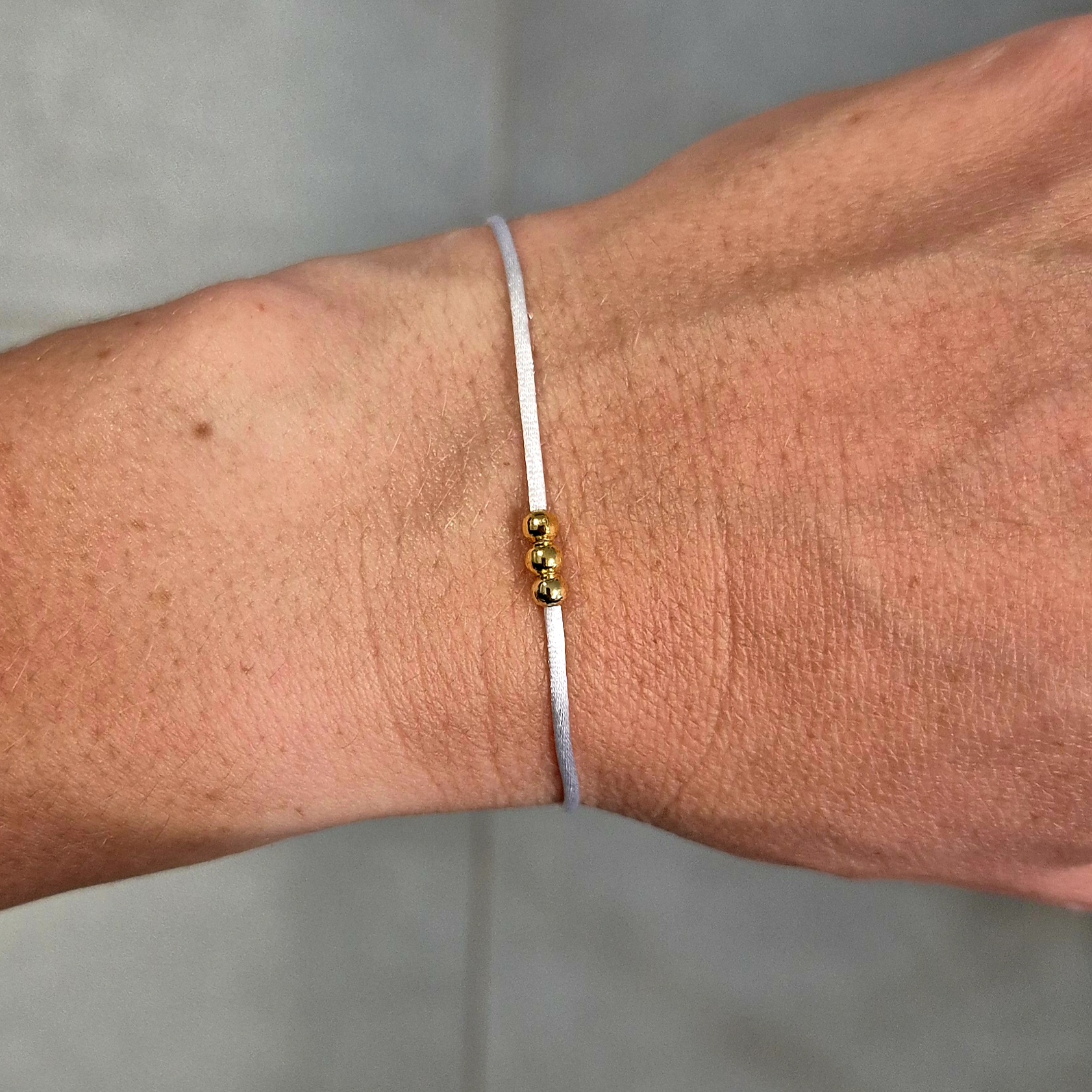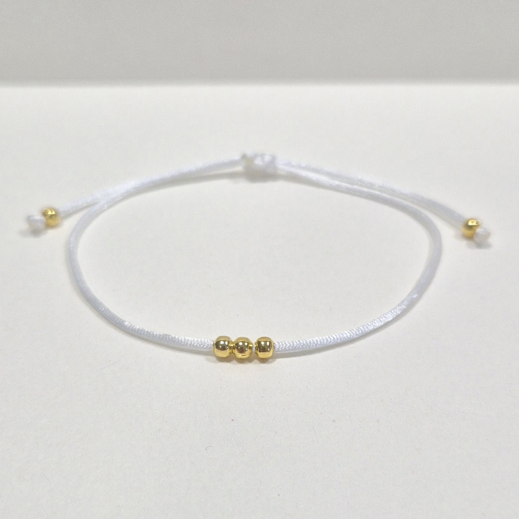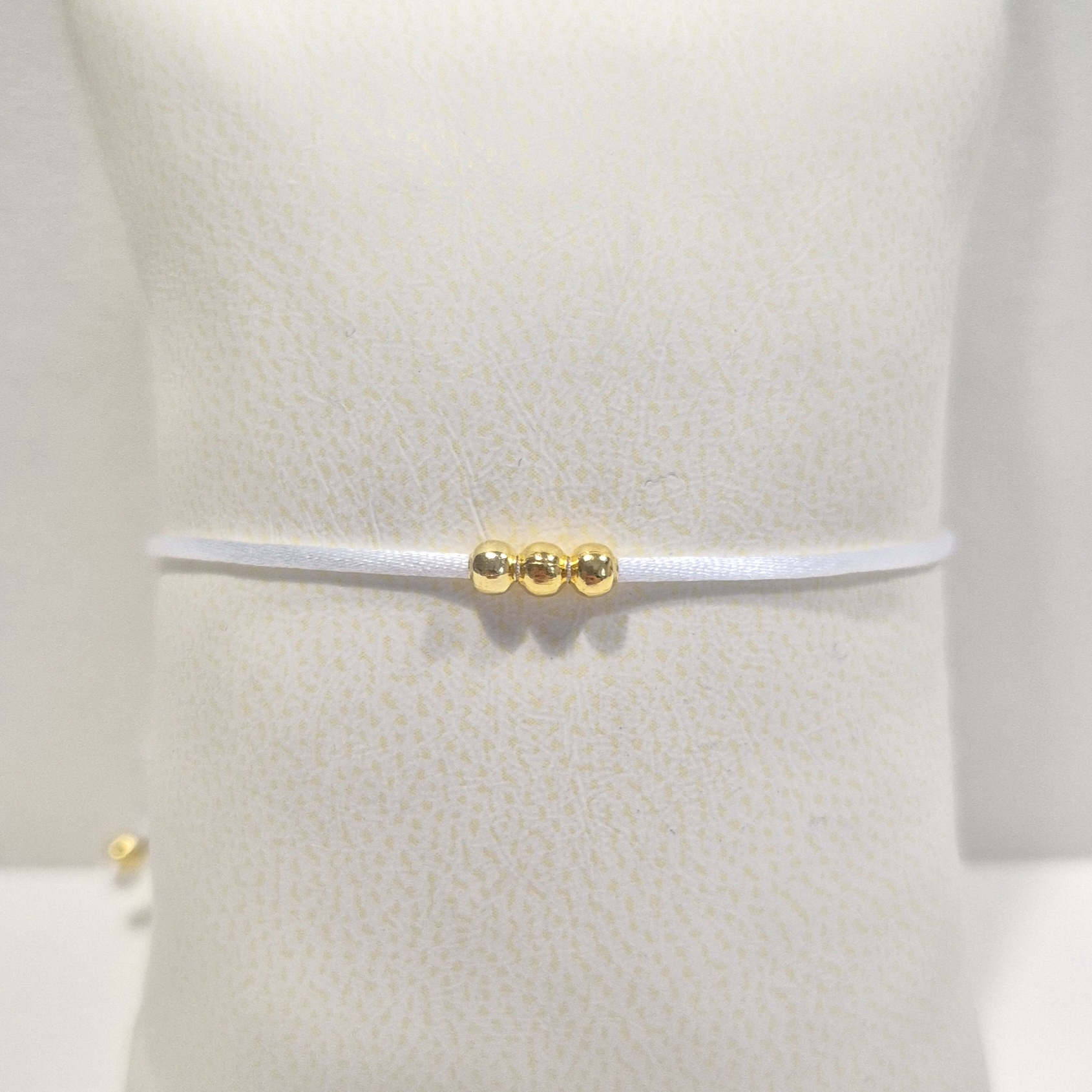 Tento náramek je vyroben z bílé saténové šňůrky, na které jsou navlečené korálky z bižuterního kovu ve zlaté barvě.