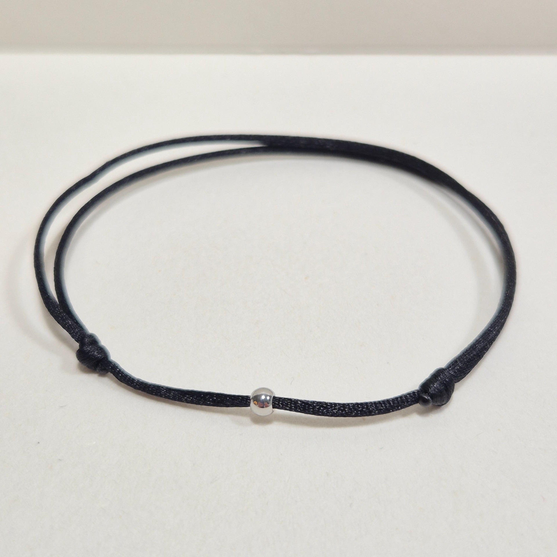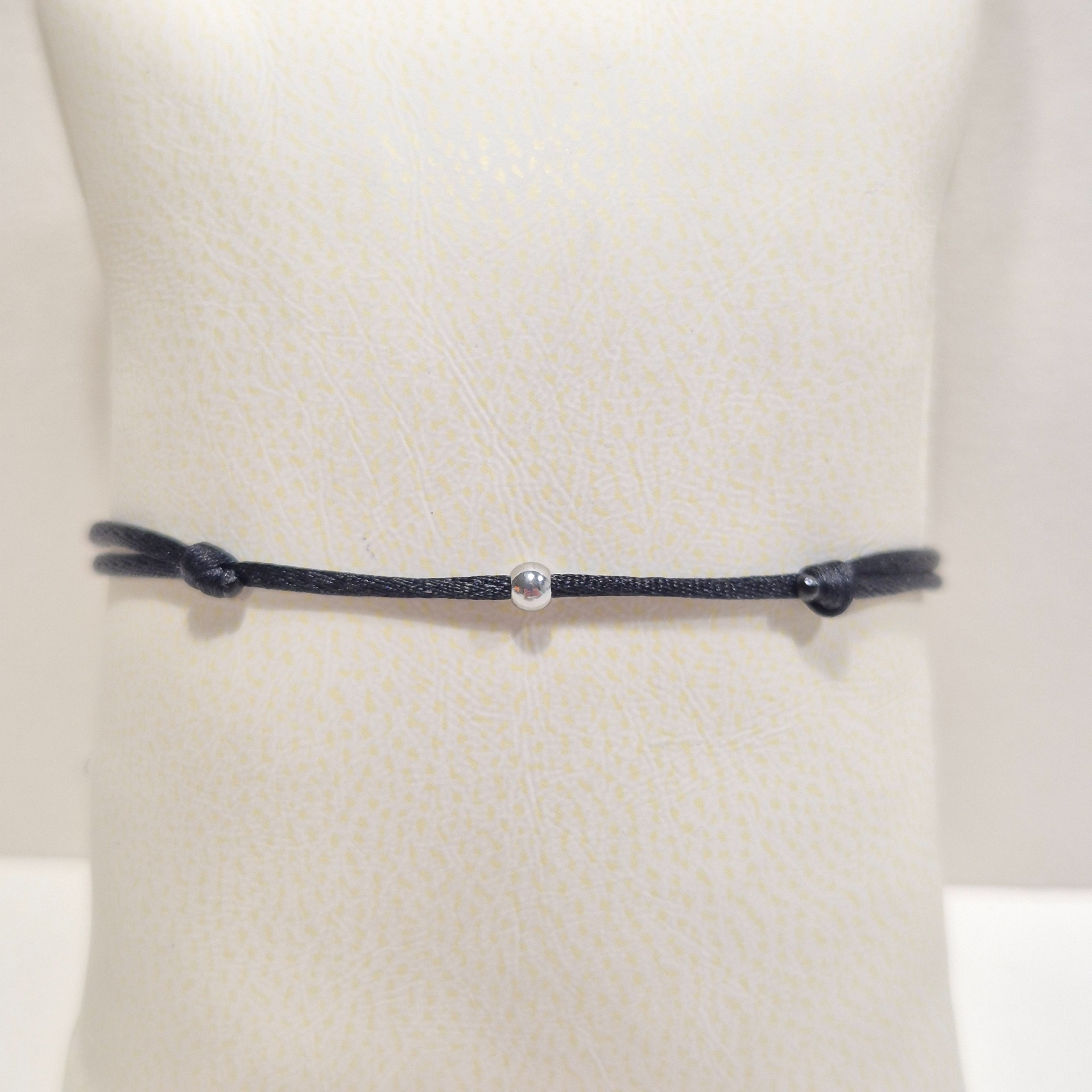 Jemný a elegantní náramek ze saténové šňůrky, doplněný decentním korálkem z nerezové oceli.