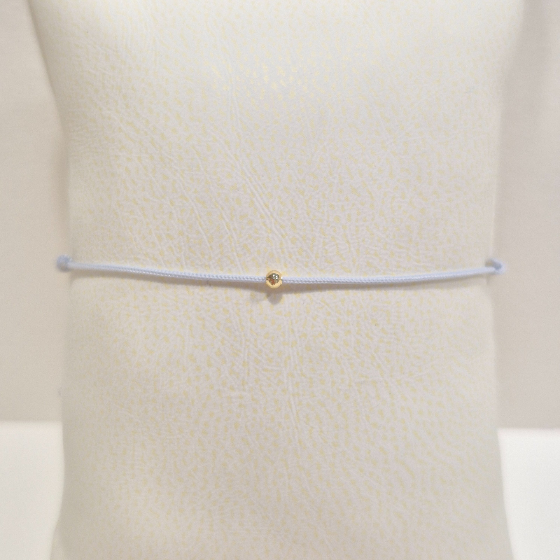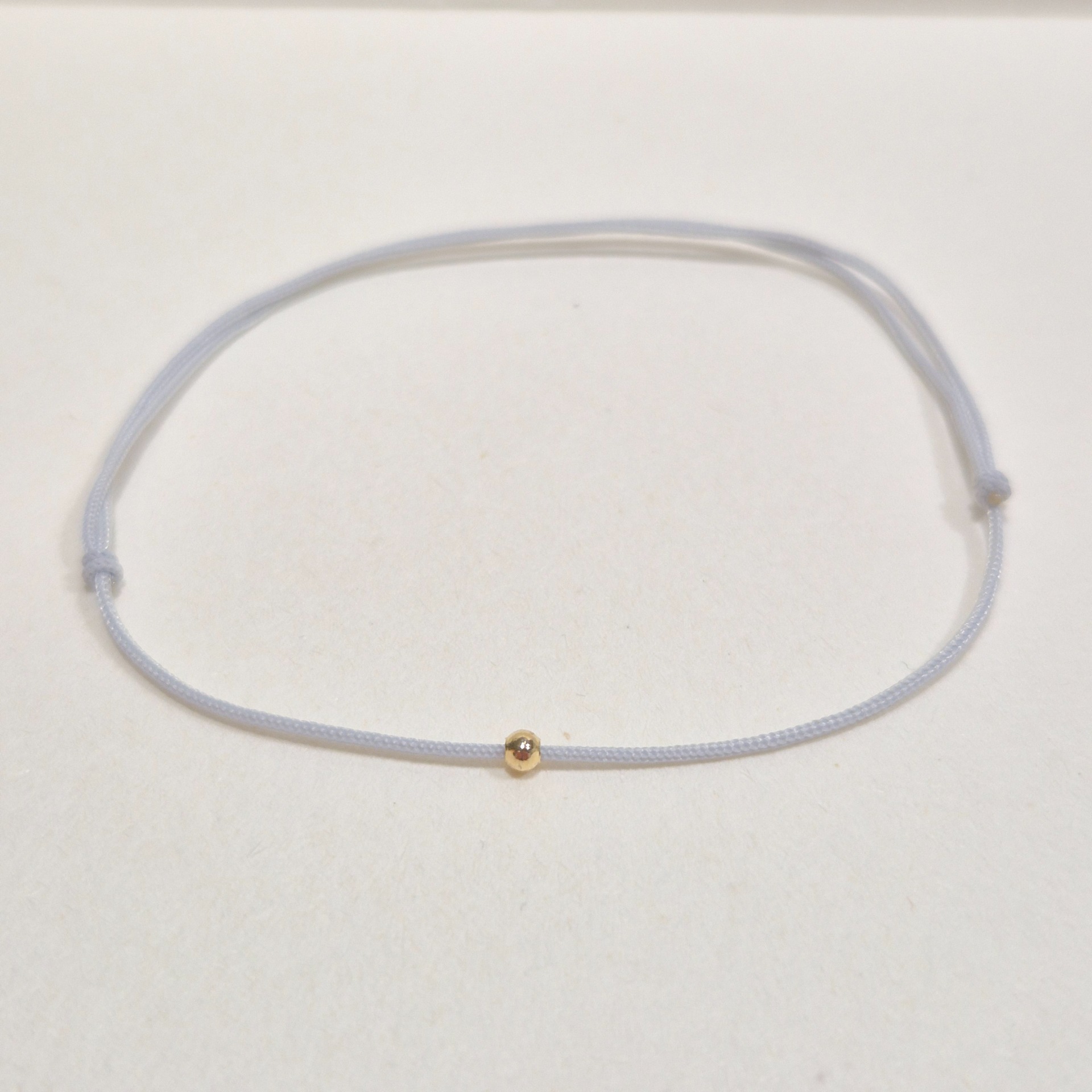 Jemný a elegantní náramek z polyesterové šňůrky, doplněný decentním korálkem z mosazi.