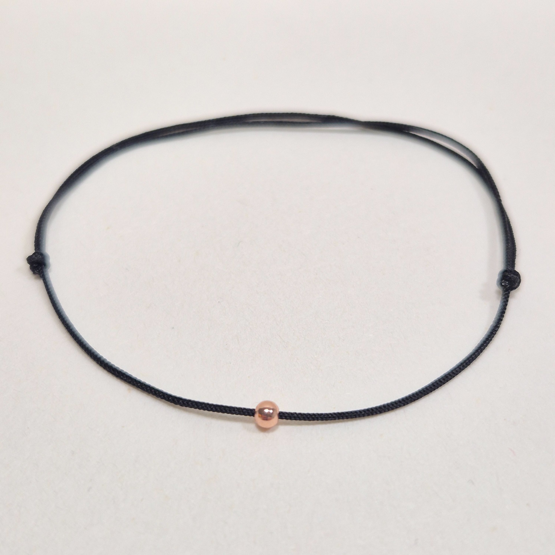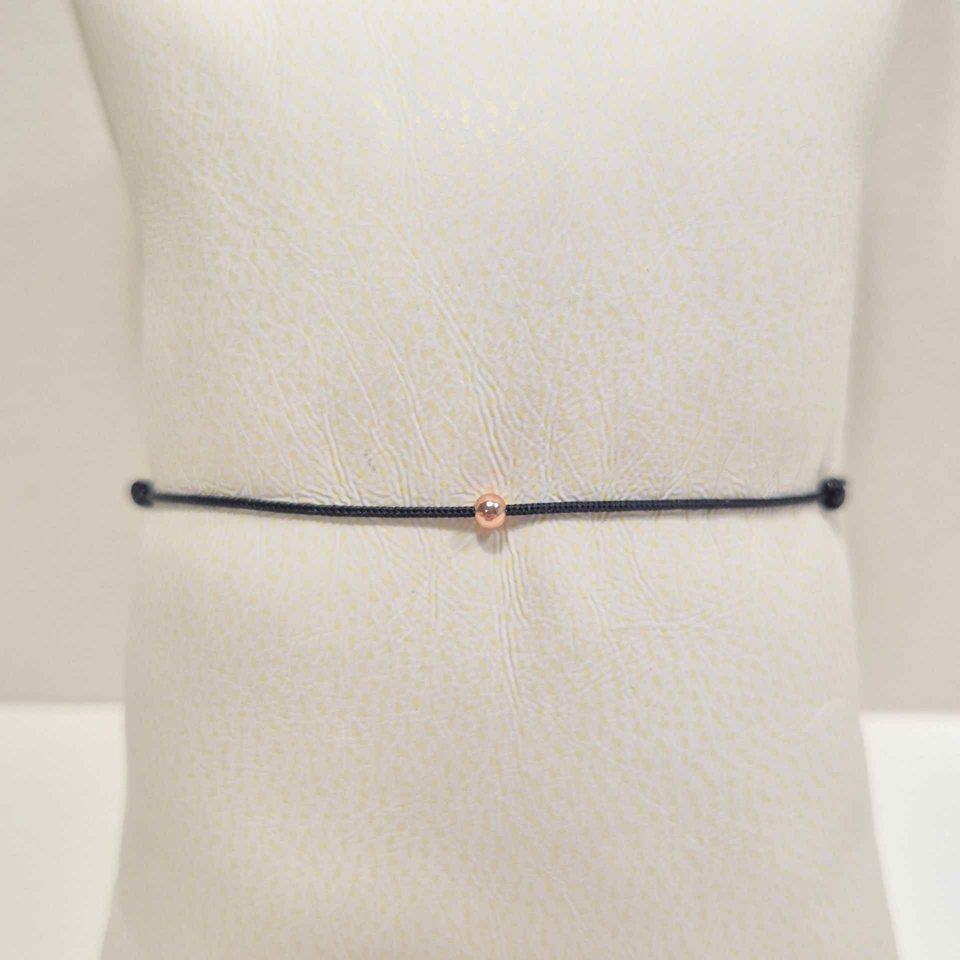 Jemný a elegantní náramek z polyesterové šňůrky, doplněný decentním korálkem z mosazi.