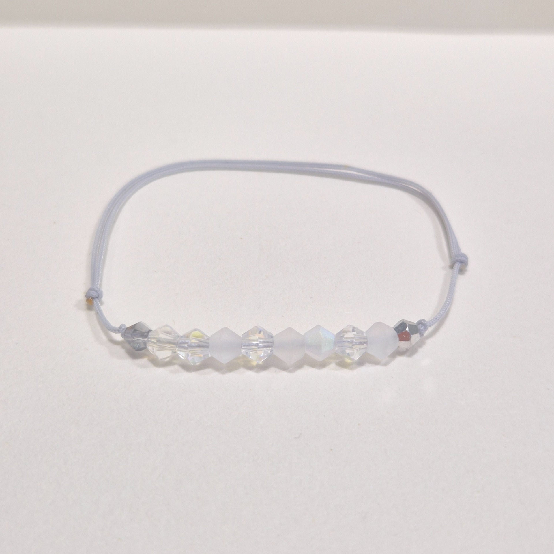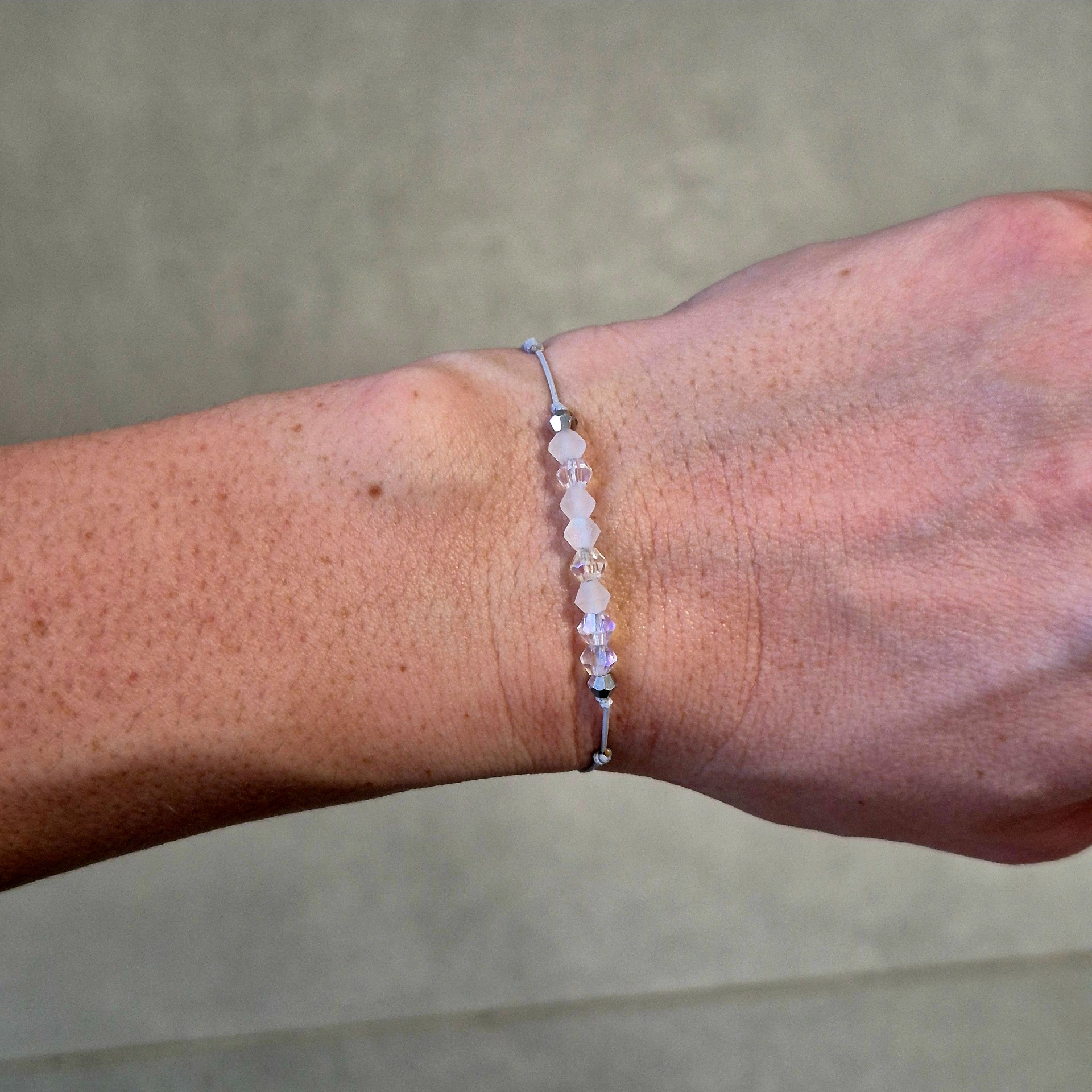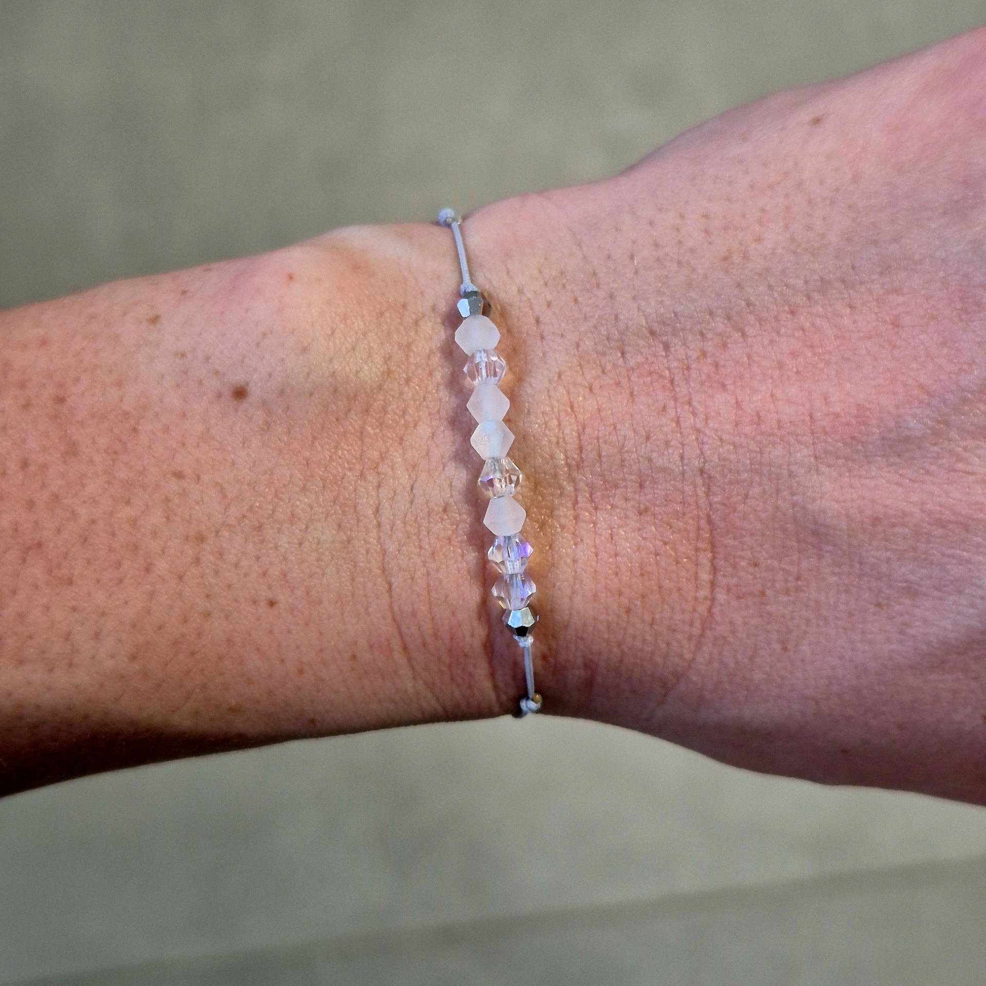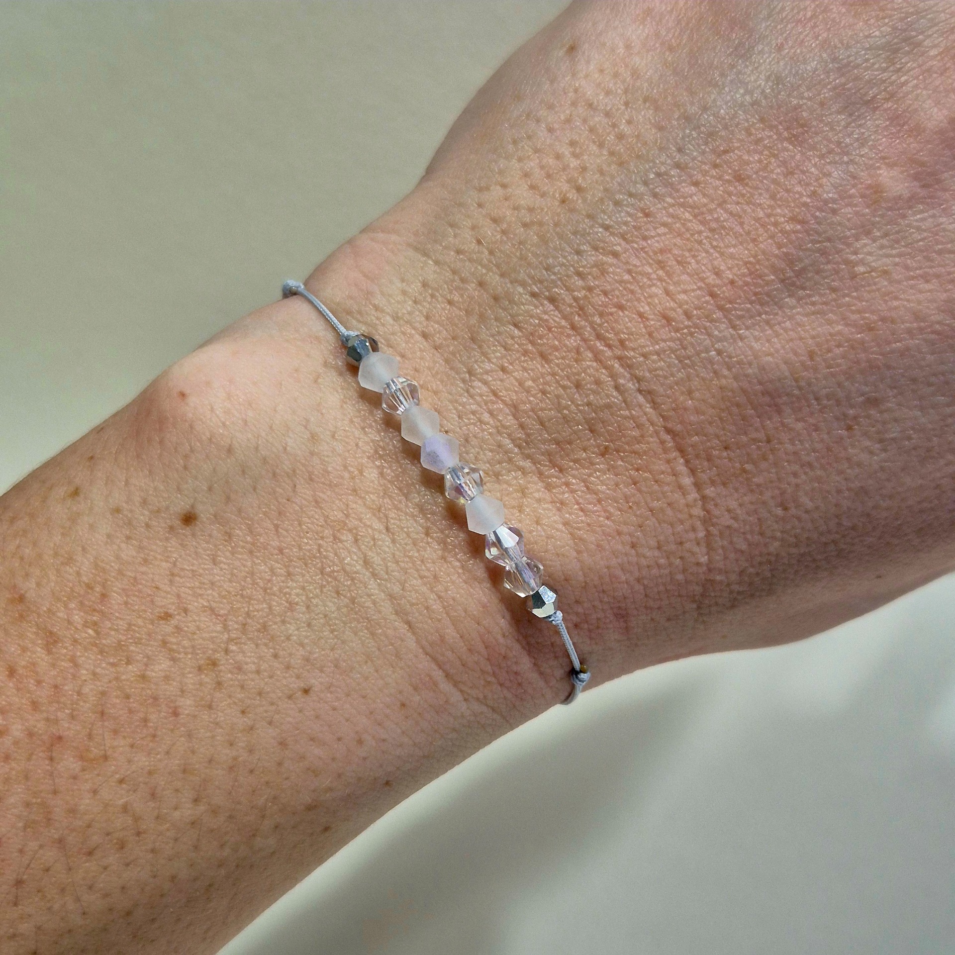Minimalistický náramek v jemných tónech bílé a stříbrné, který působí čistě, elegantně a nadčasově.