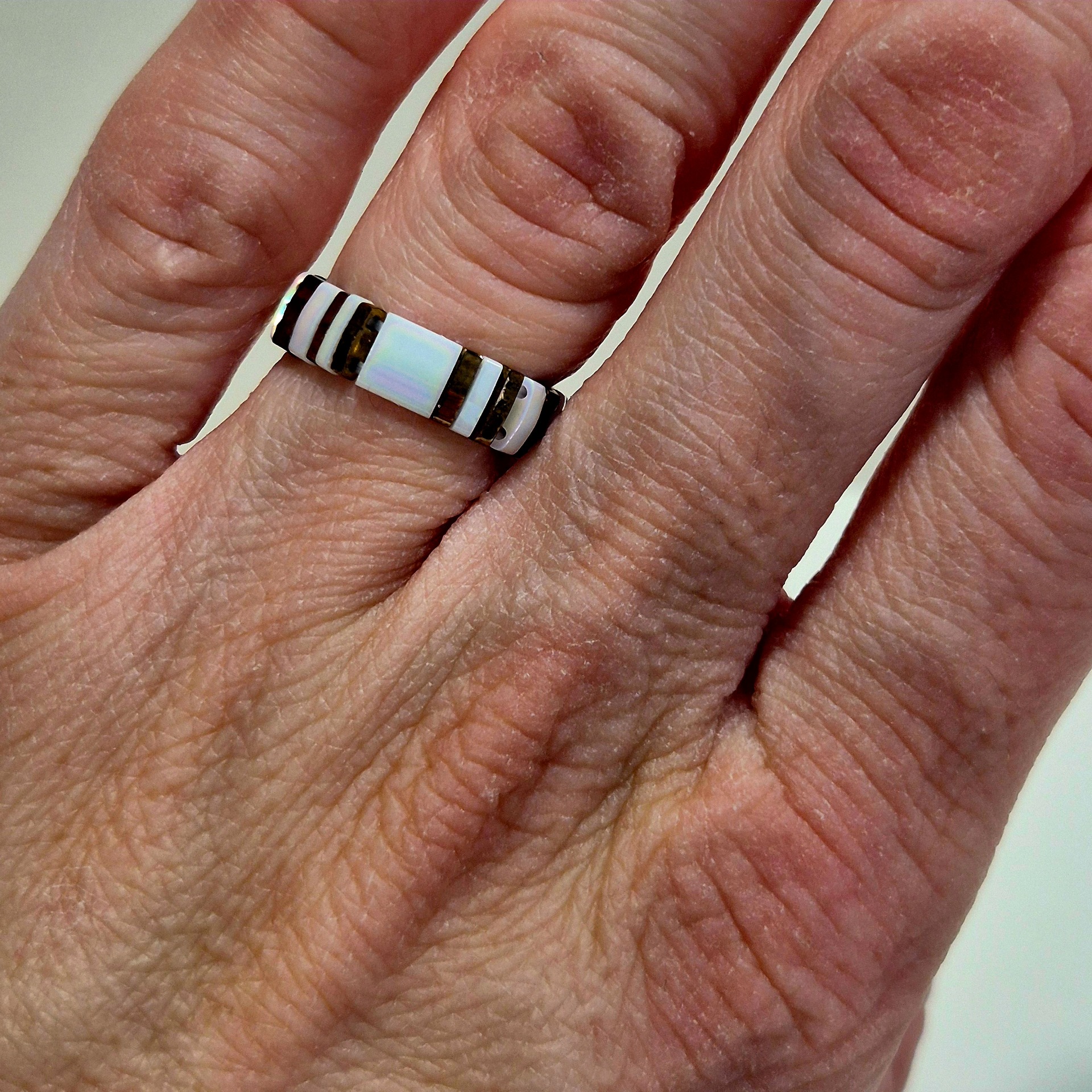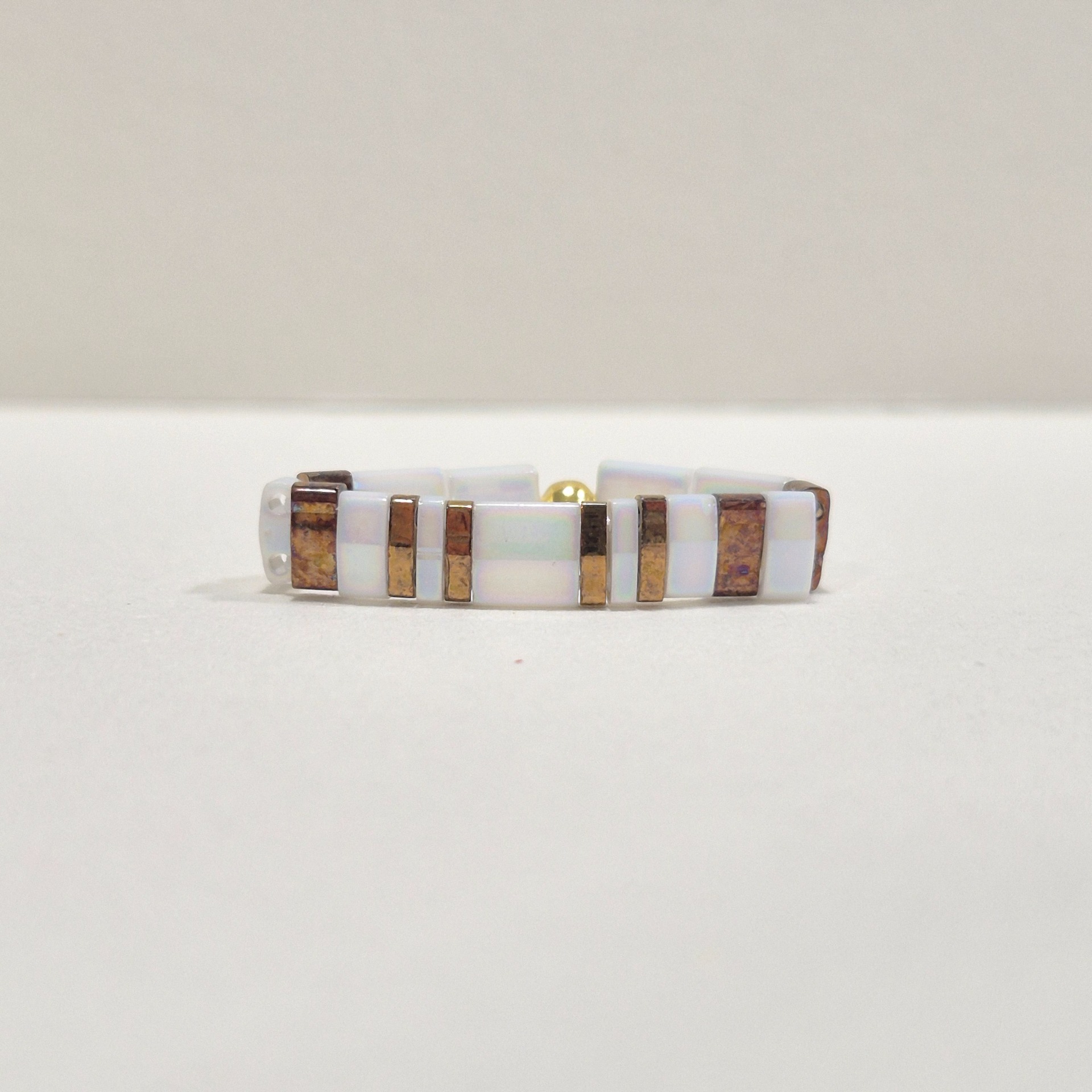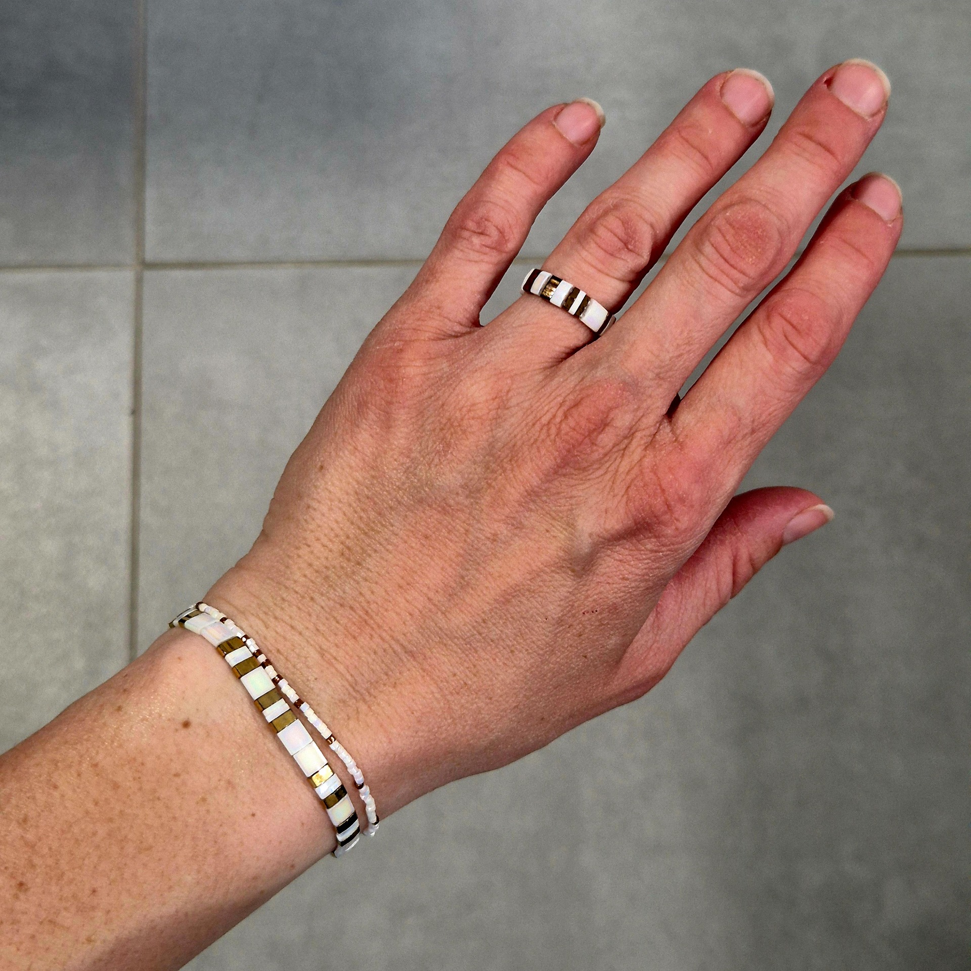 Jemný prstýnek z japonských Miyuki korálků v kombinaci perleťově bílé a zlaté. Díky světlým tónům působí velmi čistě, elegantně a žensky – perfektní jako nenápadný doplněk pro každý den i slavnostní příležitosti.